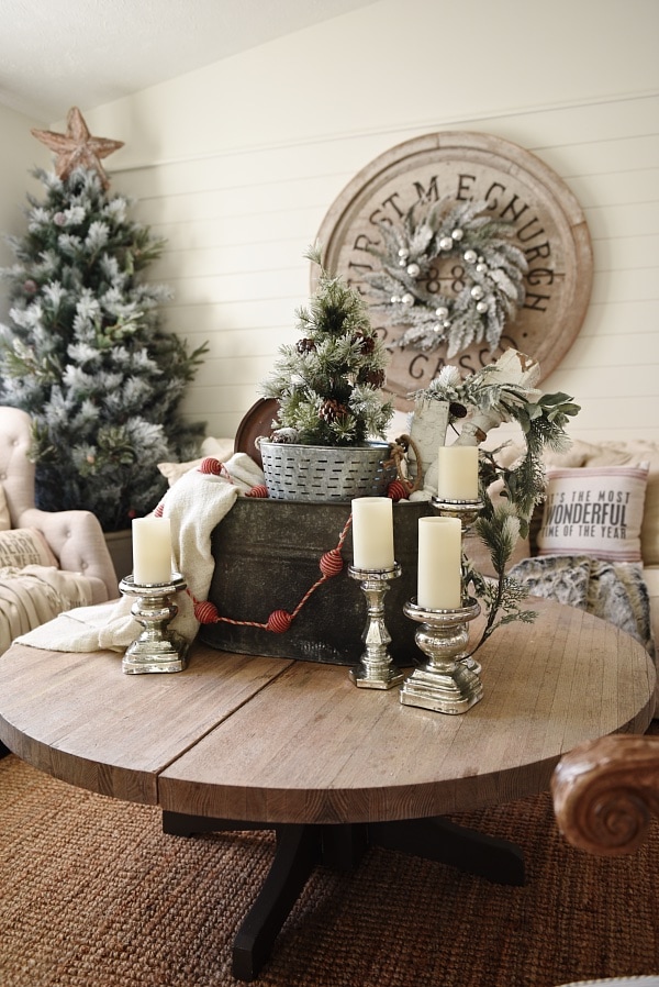 Yes. We just hung a vintage sled from our antique sign we have hanging in our living room. There was already a nail in the center of the sign so I simply tied a rope on the back of the sled connecting the two sides & used that as the hanger. So simple & I feel like it adds a huge “Christmas” statement & focal point. If you don’t have a vintage sled lying around, Jose & I made one last week & we blogged it [here] if you want to make your own! Mind you that the room is not fully styled & neither is the couch, but it’s coming along quite nicely & I really am loving the sleds this year. That garland around the sign? I got it at Michaels & I simply stapled it around the edge of the sign. Just imagine me balancing up on the top of the couch trying to do that. Cute huh?