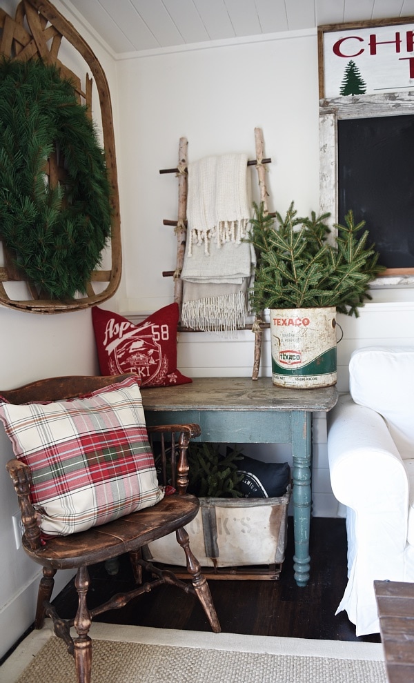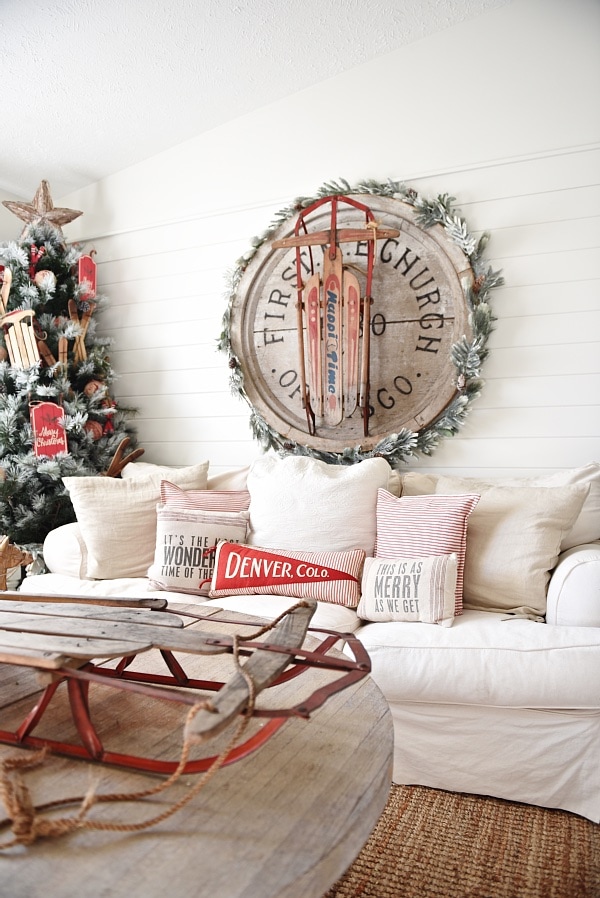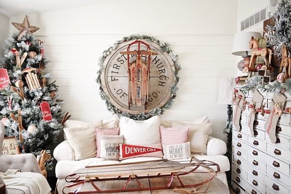 I have been sharing a few sneak peeks of our Christmas decor as it slowly goes up in our home & as it evolves as we approach closer to Christmas. I have said it before, but I will say it again. I know that I’m decorating earlier than your average person for christmas, but there is a few reasons. One: Last year at this time I was packing up our North Carolina home & getting ready to move across the country & really was unable to decorate our Michigan home a whole lot for Christmas. I remember telling myself.. next year Liz, next year. I couldn’t wait any longer than after halloween. Two: I hope my blog inspires in some small way. I come here to share my ideas, projects, home decor, & more to hopefully inspire you once in a while. I want to get some Christmas posts up before the masses start decorating so that maybe I can share some ideas. Now that I explained that little fact, there is something I did in our Christmas decor this year that I couldn’t wait to share because I kind of love it. We hung one our vintage sleds in our living room & this is what it looked like today…