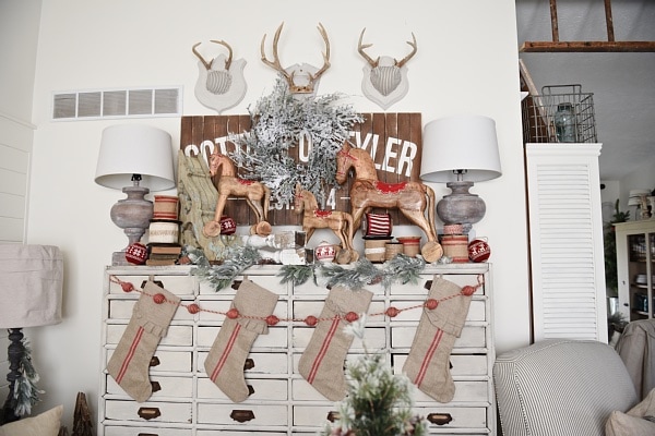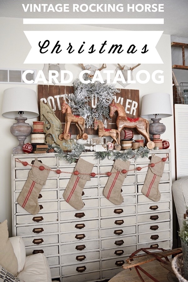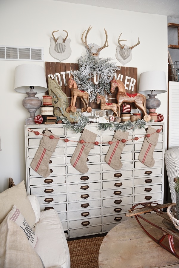 The color I used to paint the card catalog is my NEW FAVORITE color & my new favorite kind of paint, Maison Blanche lime paint in white pepper. I’ll let you get the info about the lime paint & why it’s so awesome from the website [here], but it really is my new favorite paint to play around with because it’s different than chalk paint & has a whole different texture. When the card catalog is done I will do a full review of the lime paint after I wax over the paint [In these photos it has not been waxed yet] So far I love the paint & how the card catalog is turning out. Right now I think the card catalog looks a little flat because it hasn’t been waxed, & that once it’s waxed it will bring out the color and more of the character more. ย And that Christmas decor? Let’s talk about that. In our upstairs living room I really wanted to bring in pops of red among all our neutrals. I centered our “mantel decor” around those rocking horses I found at HomeGoods. I then threw in some lovely sweater style ornaments I found at Kirklands & ribbon spools that I also found at Homegoods. I thought those were a fun way to bring in the pops of red & also they have that vintage feel. I honestly forget where I found the stockings at but you can find these at A Cottage In the City. The garland is from Michaels, & the wreath & the garland are both from HomeGoods as well. You can see the posts for the lamps [here] & the antlers [here].