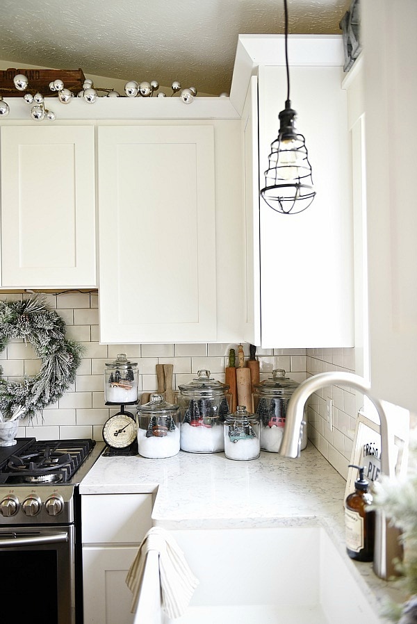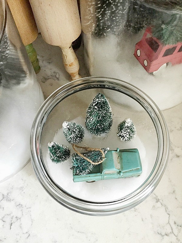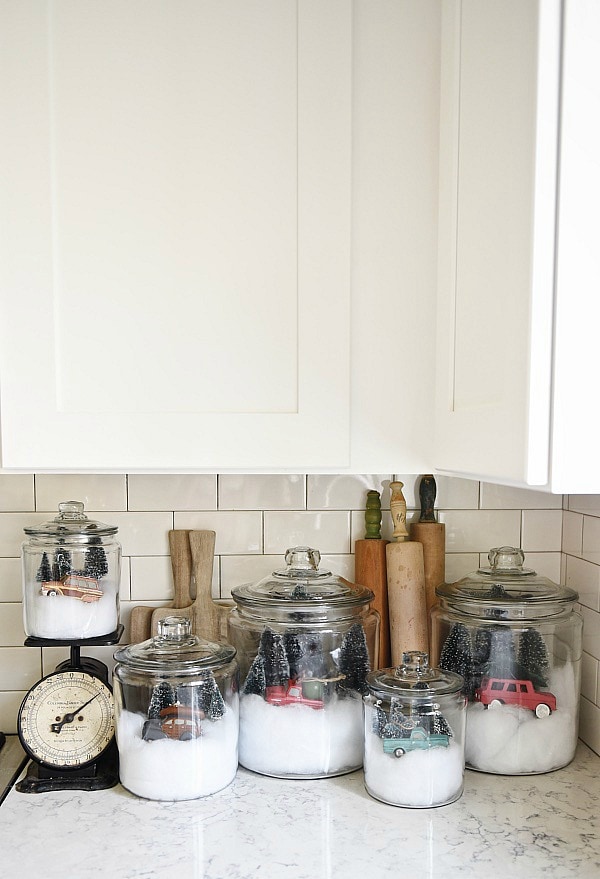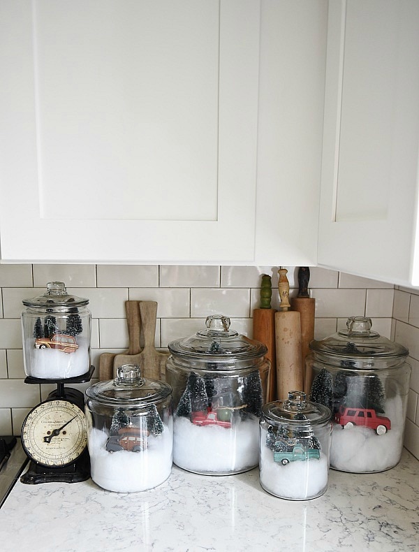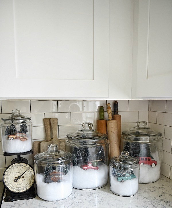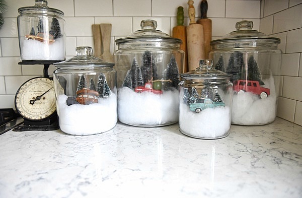 These guys were so hard to take photos of because of the glare of the glass & I am no pro blogger, but you get the idea. I mean it’s cute car ornaments in a jar. How cute right? I had these jars from all over the place like Target, Walmart, & Home Goods. You can find these glass jars just about anywhere. I had this faux snow from Hobby lobby, the Christmas trees from Michaels, & the lovely car ornaments are from Sew A Fine Seam [here] & that car on the far right is actually from Target. I simply first started by turning on some Christmas music, this step is a must! Once your Christmas music is playing, you start putting snow in the bottom of the jars & then layering the trees on top as you please. I then placed one car in each jar. I mean, you can’t get easier. These jars would look great with more ornaments inside, little houses, woodland creatures, & more. These snow globe jars would be great styled on a mantel, on an entryway table, styled on a bookshelf, & more. I styled ours in our kitchen, but the possibilities are really endless.