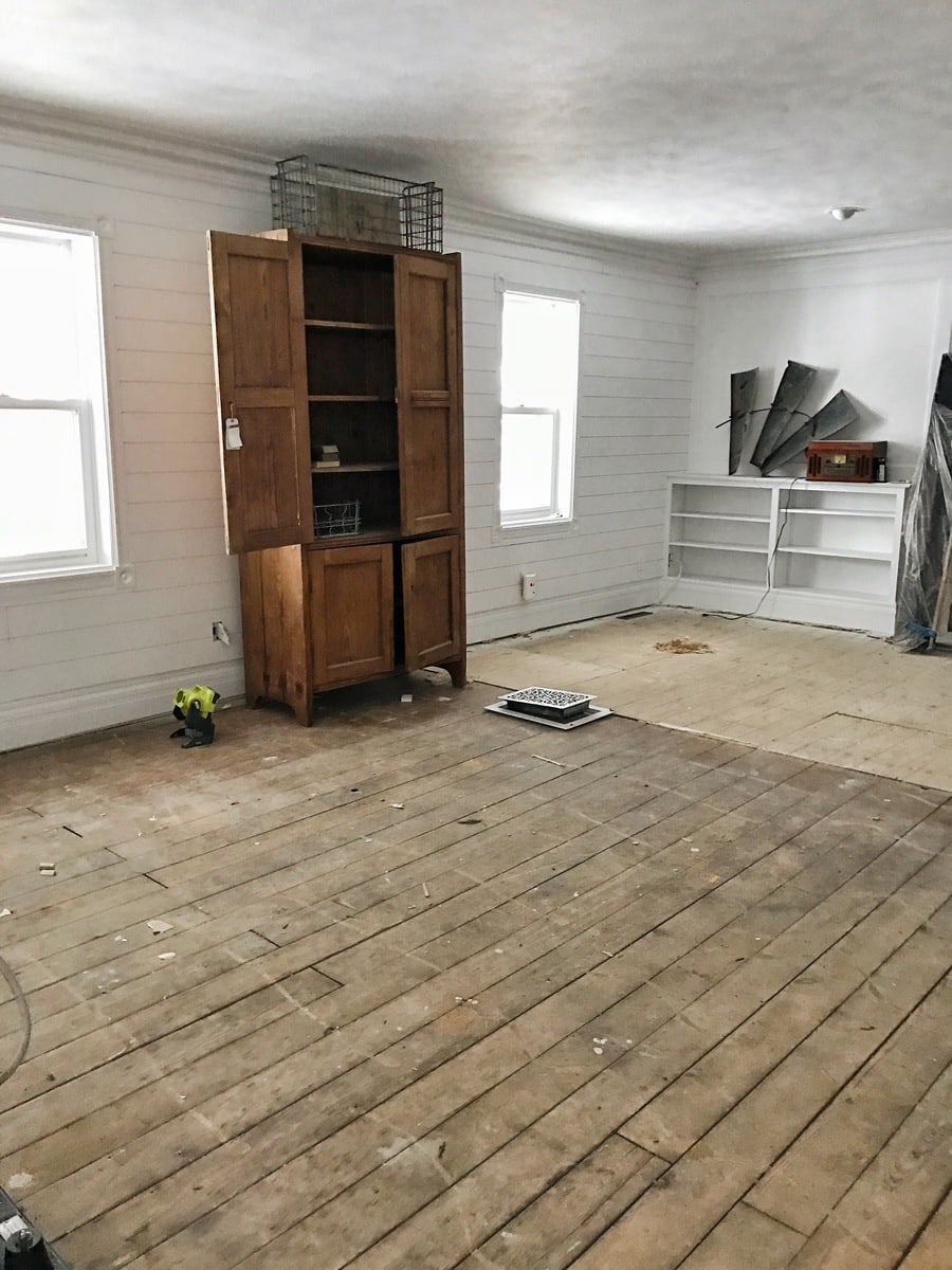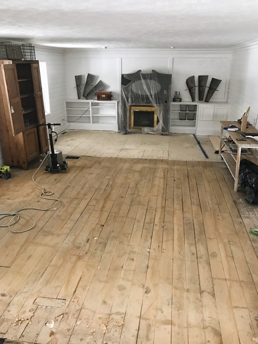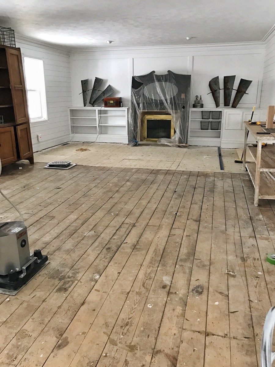 Ok, it may not look like much, but trust me.. it’s so much smoother & most importantly ready for paint! It kind of feels like when you do major renovations you take 10 steps back to take one step forward. A little over half of the room has the original flooring from the 1800’s that was covered by subfloor and carpet. When the subfloor and carpet were ripped up we were left with lots of glue on the flooring & we discovered that the last 1/3rd of the room near the fireplace did not have original flooring, but only subfloor. That is when we decided that we were going to paint the flooring to make it all cohesive. BUT we were going to replace the subfloor near the fireplace with boards until we read something that Natalie from Hammade furniture wrote the other day. She wrote about how she hand scraped her subfloor to look like boards before she painted them. Ummm hello! So we thought we would give it a try & Jose hand scarped the subfloor in the living room to resemble boards & so far so good! We are anxious to see what it looks like when we put paint on it, but it will save us a ton of money if it works!