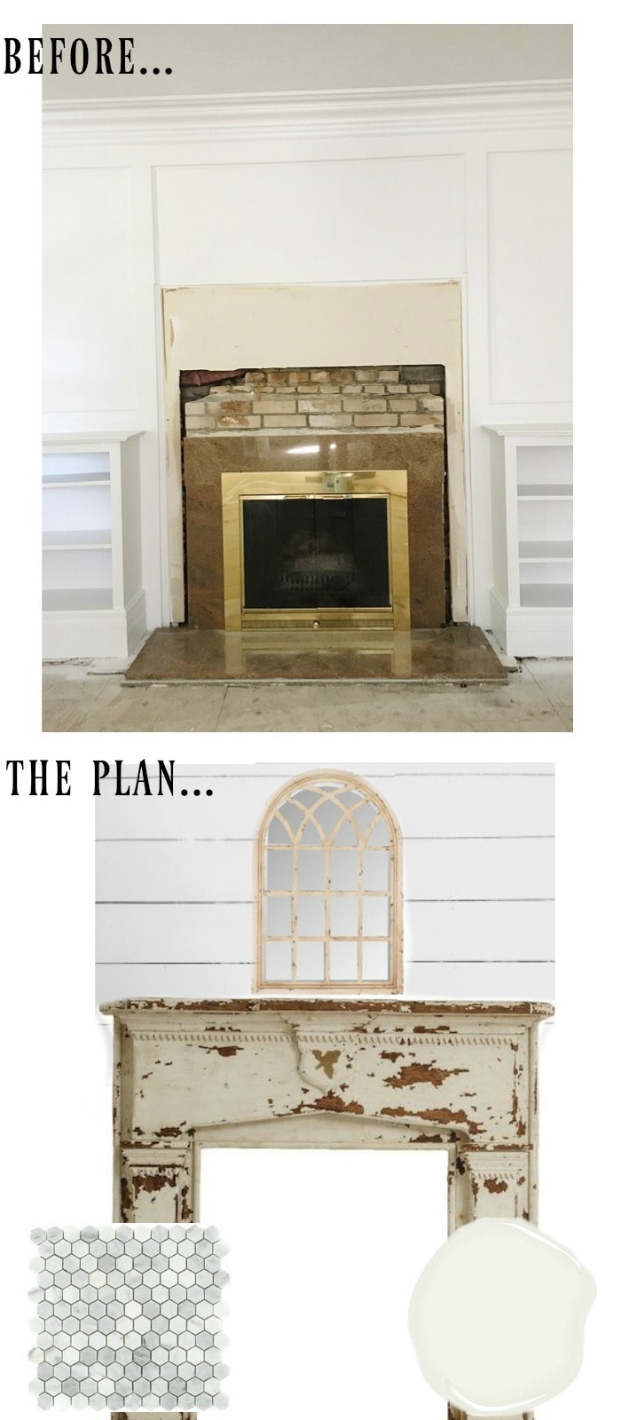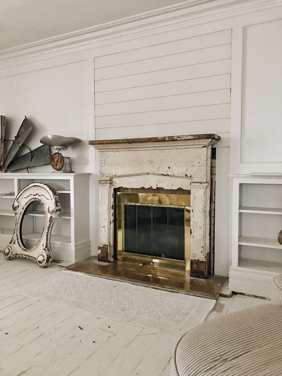 Way back in the beginning of the front living room makeover I discovered the original fireplace behind the wall. I thought it was the greatest discovery ever. I was over the moon & felt like the luckiest girl in the world, but my dreams were completely deflated when I discovered that someone had written all over the brick, it had been damaged, & there was marble glued to the whole bottom half of it. The walls around it also needed to be repaired. It was just a huge mess that we didn’t want to get into right now. Of course all of this is fixable with a lot of work [& time] [& money] SO there has been a change of plans now, at least for the near future, we decided to close in the old brick fireplace with a simple shiplap wall that can be opened up later if we decide to do something with the fireplace later. We are also going to use a reclaimed chippy mantel that we had in the dining room previously over the fireplace. The plan for over the pink marble on the floor? Some marble tile will be the answer to that. So far we have the shiplap done over the fireplace which was the first step in the makeover…