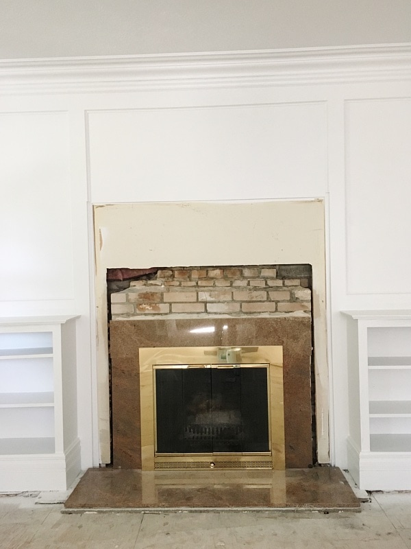 Here is what the fireplace looked like after I ripped into the wall & before we put the shiplap up….