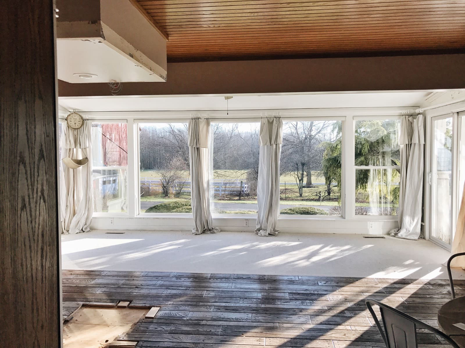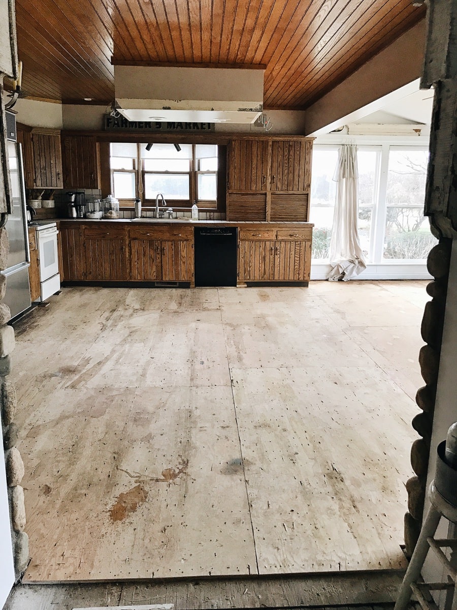 It get’s uglier before it gets prettier right? & wow is this ugly. The plan for the flooring in this space? The details aren’t hammered out yet, but the dream is 8″-10″ pine boards either painted or stained through the entire kitchen and sunroom area. But first.. fixing the subfloor & doing some more dirty work like removing the upper cabinets, cleaning and painting all the wood, removing the windows and replacing them, and so much more. I can’t wait to get to all that fun stuff, but there is still a lot of dirty work ahead of us. Aren’t you excited to see this be a light & bright space in our home? I can just imagine how beautiful it’s going to be be! What do you guys think of our progress so far? Kind of a mess huh? Thank you so much for stopping by the blog today & for following along on our farmhouse fixer upper journey! Be sure to follow me on Facebook & instagram for more behind the scenes. xx