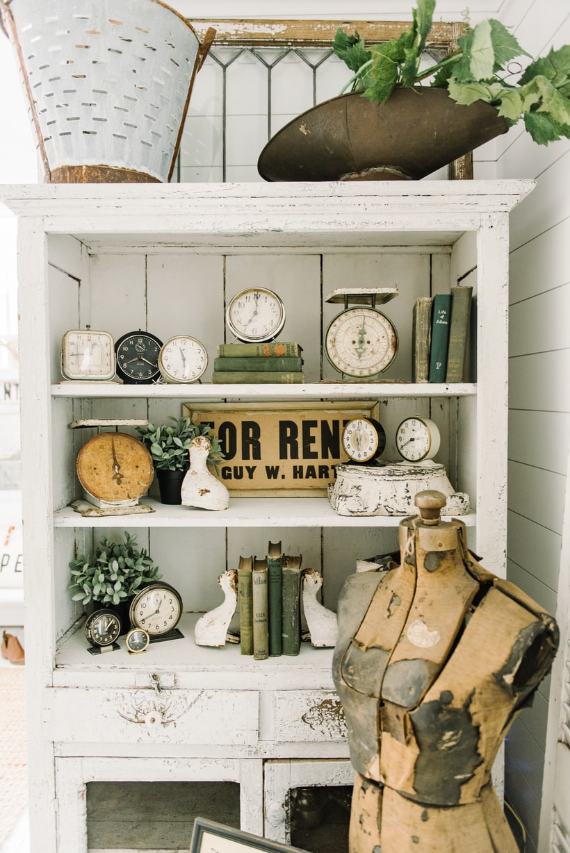 The floors aren’t finished in this room & one half is still torn up by the fireplace, BUT this little corner is so happy & sunny. I’ve decorated it with a collection of my favorite things from this antique dress form, some chippy white shutters, a lead glass window, a white chippy cabinet that holds some of my green book collection & clocks, & of course my antique typewriter that I love so dearly. I’m a collector of all things so having cabinets & little corners like this to display things is a dream come true. I know the “trend” is more clean & modern, but my heart is always going to stray to chippy &