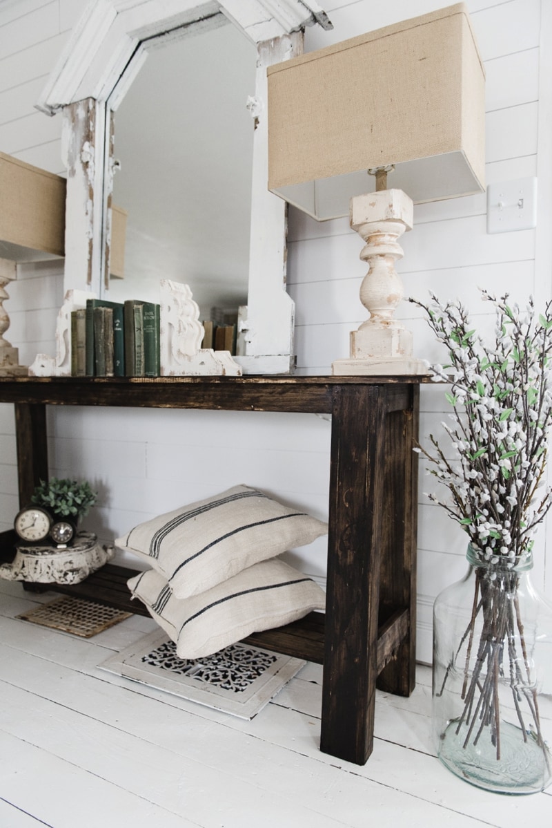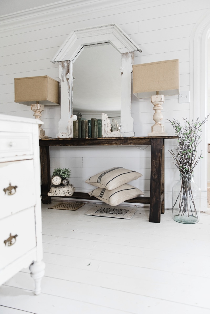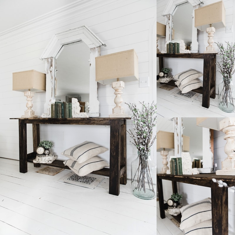 It is in a way like many consoles he has made before like this one [here] [here] & [here], but this one has a slatted shelf at the bottom & a thinner top. The legs are also hollow and four sided unlike before when he was using one piece of wood. Usually when he builds furniture he shares the plans on his blog [here], but he wasn’t sure if you guys would want them. If you do, leave a comment below & he will share all the details. He had a lot of fun making this one & we brought it to the store the next day & it sold right away. I’m kind of regretting that & I think I need him to make me one for the farmhouse…