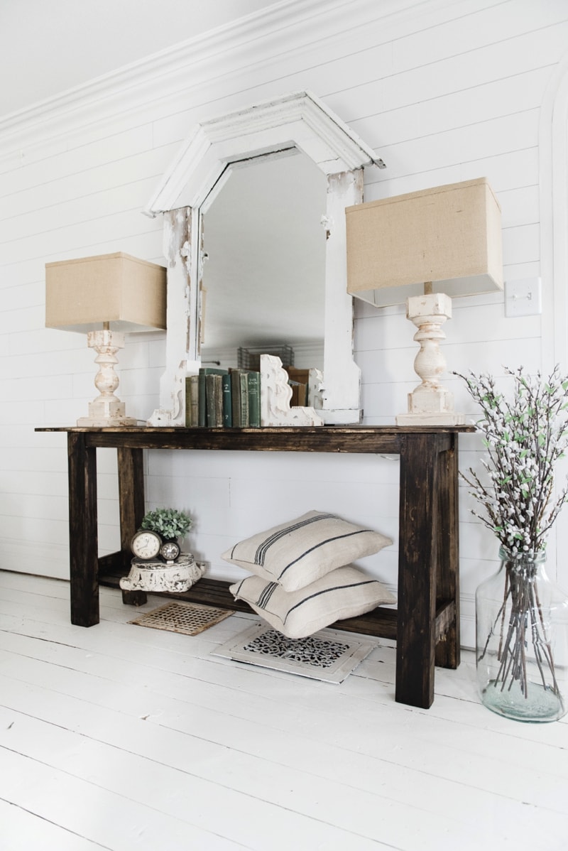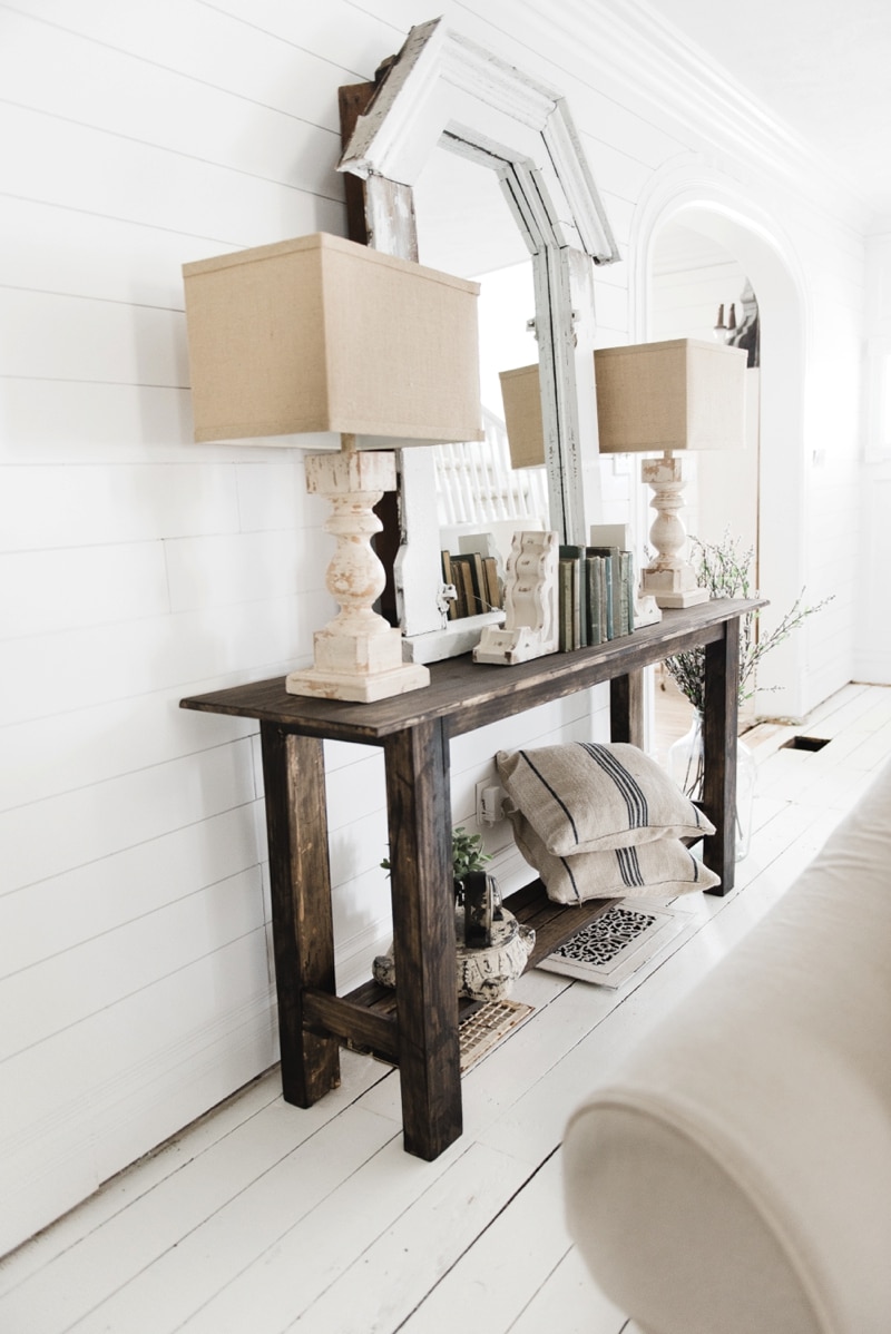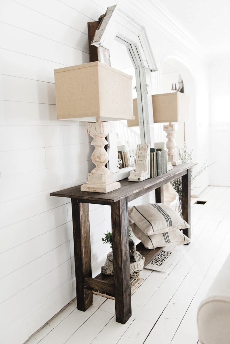 This piece only cost about $70 to make & a few hours of time. I styled this one in the front living room to share with you guys & I love the contrast of that dark stain with the white flooring & walls. Usually the pieces he makes are bulkier & more substantial so I’m loving this dainty version. It would make a great TV console, dining room buffet, sofa table, entryway table, & so much more. What would you use it for? Let me know in the comments below, find me on Facebook, & chat with me on Instagram. Thank you guys SO MUCH for stopping by the blog today! xx