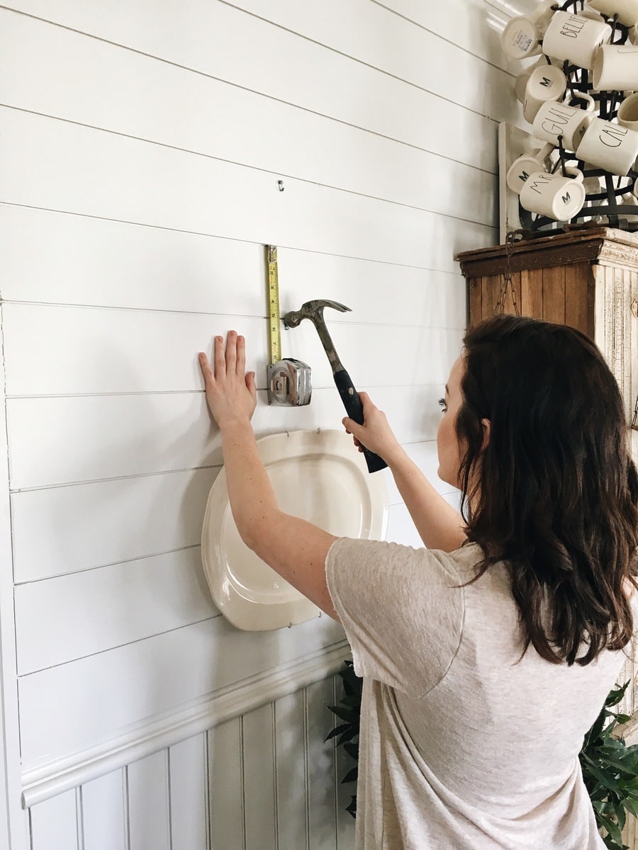 Typically I like to use [These] plate hangers that you can grab from a craft store or sites like Amazon [HERE}, but you can also use [These] or any plate hanger you want. You will need a tape measure, a hammer, & a laser level works really well for this if you have one. After that it’s truly up to you how high, how low, or where you want your plates placed. I chose three different platters from small to large [even though I’m thinking I need a tiny one above the three still]. I started at the bottom with the large platter and measured up from the chair rail & used the shiplap line as guidance for hanging the plate hangers on the wall. I’m starting to learn that shiplap is great for helping to measure where to hang things on the wall. Anyways, once you decide on placement it’s pretty easy to create a plate wall.