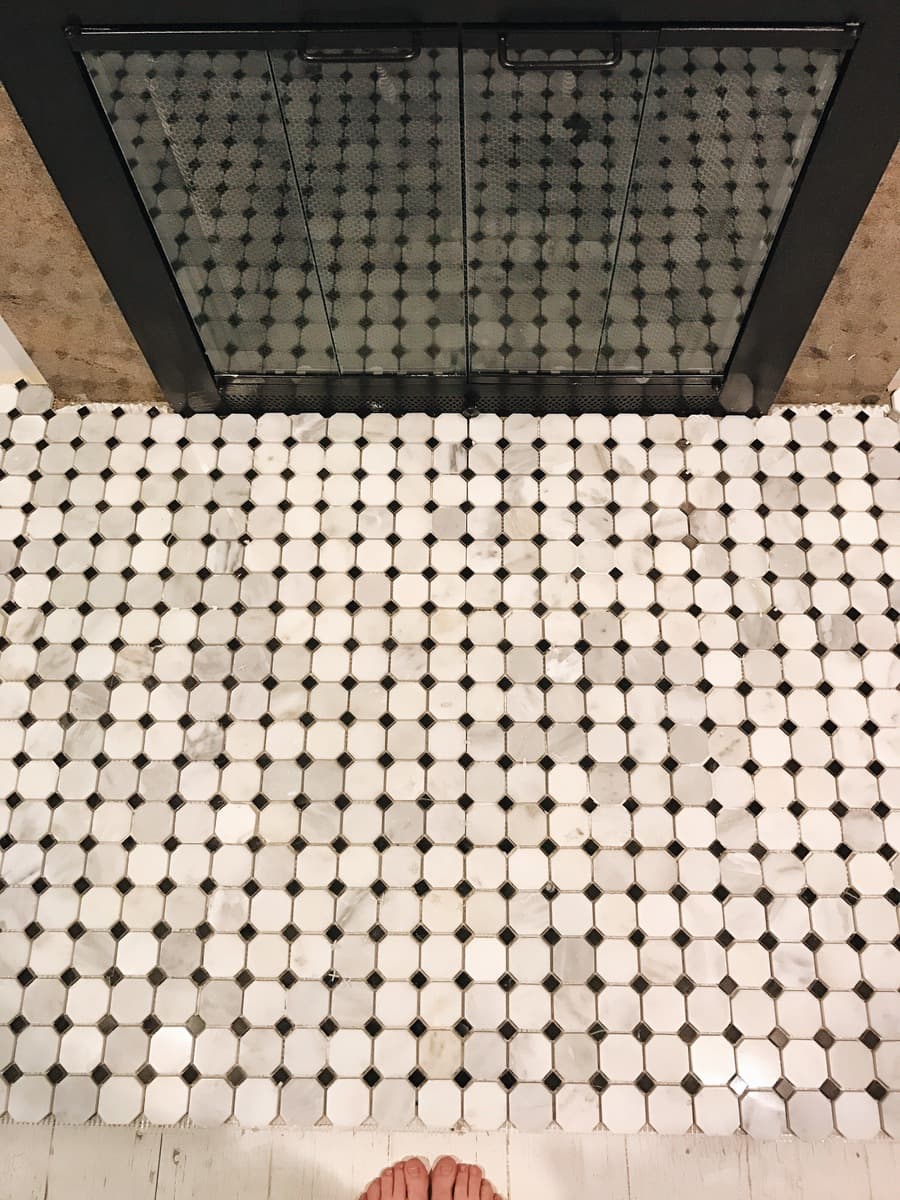 This past weekend was an interesting one. We tried something for the first time… tiling! Ok, so I’m sorry, but I can’t be the only one who thought that tiling something small would be super simple. I mean the tile comes on sheets.. you lay some glue.. stick it down.. and then grout.. & voila, you have a tiled surface. No. No. No. It doesn’t work like that. It’s actually quite the process & as first timers we learned a lot. It was actually hard even before we started laying the tile.. picking out the tile was awful. There are so many options & I honestly was stuck between brick, subway tile, penny tile, & the list goes on. We ended up going with a classic octagon marble tile against what most people suggested we do [majority said subway tile, which I loved as well], but my heart was just drawn to the classic look with the pop of contrast of these marble tiles. Also, when I asked for suggestions on Instagram for tile, I forgot to mention that we were only tiling the hearth by the fireplace & not the entire fireplace surround…