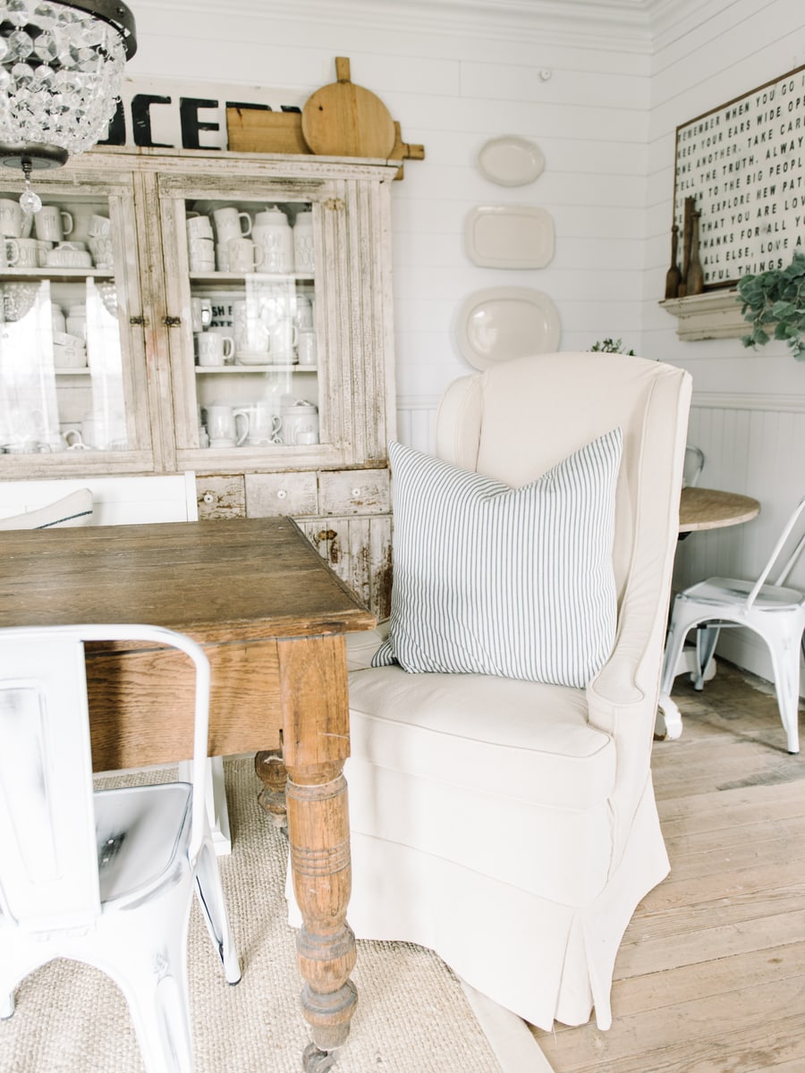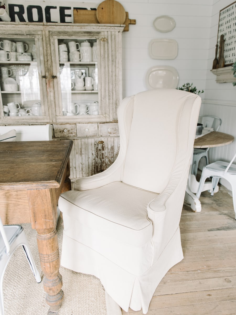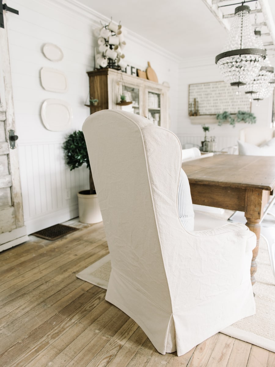 Jessica made the slipcovers from regular old drop cloths just like the rest of the sofas & chairs we’ve had done in our home by her. We love how durable the drop cloth is & the look of it as well. Also, it’s super cheap. I’m in love with how these turned out & how they add a little vintage drama in our dining room that I feel pairs perfectly with the long farmhouse table, crystal chandeliers, & large primitive cupboard in the background.