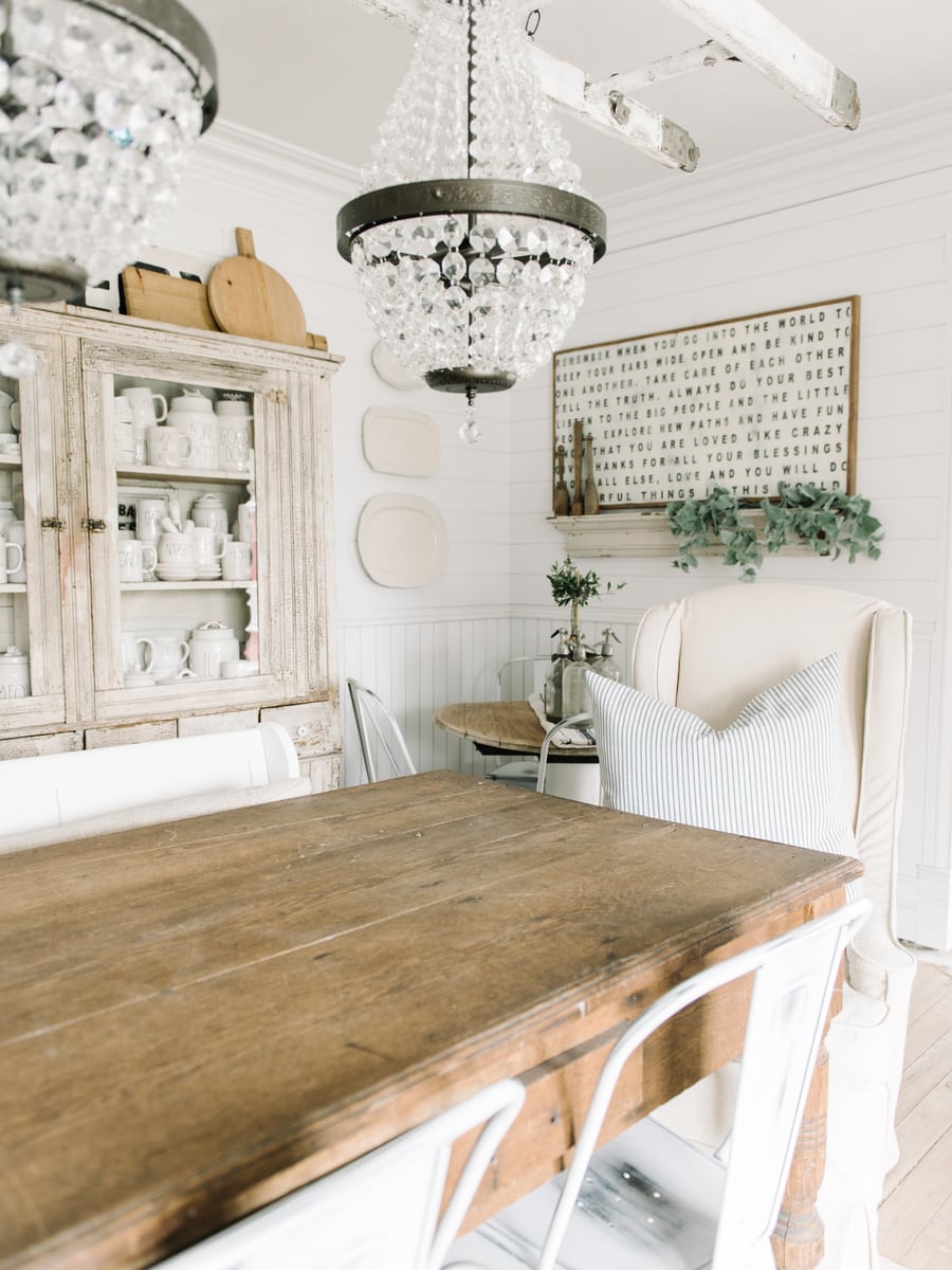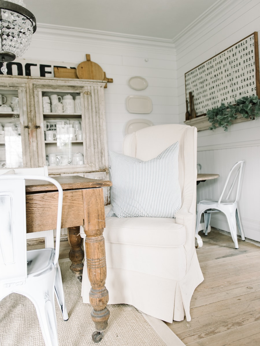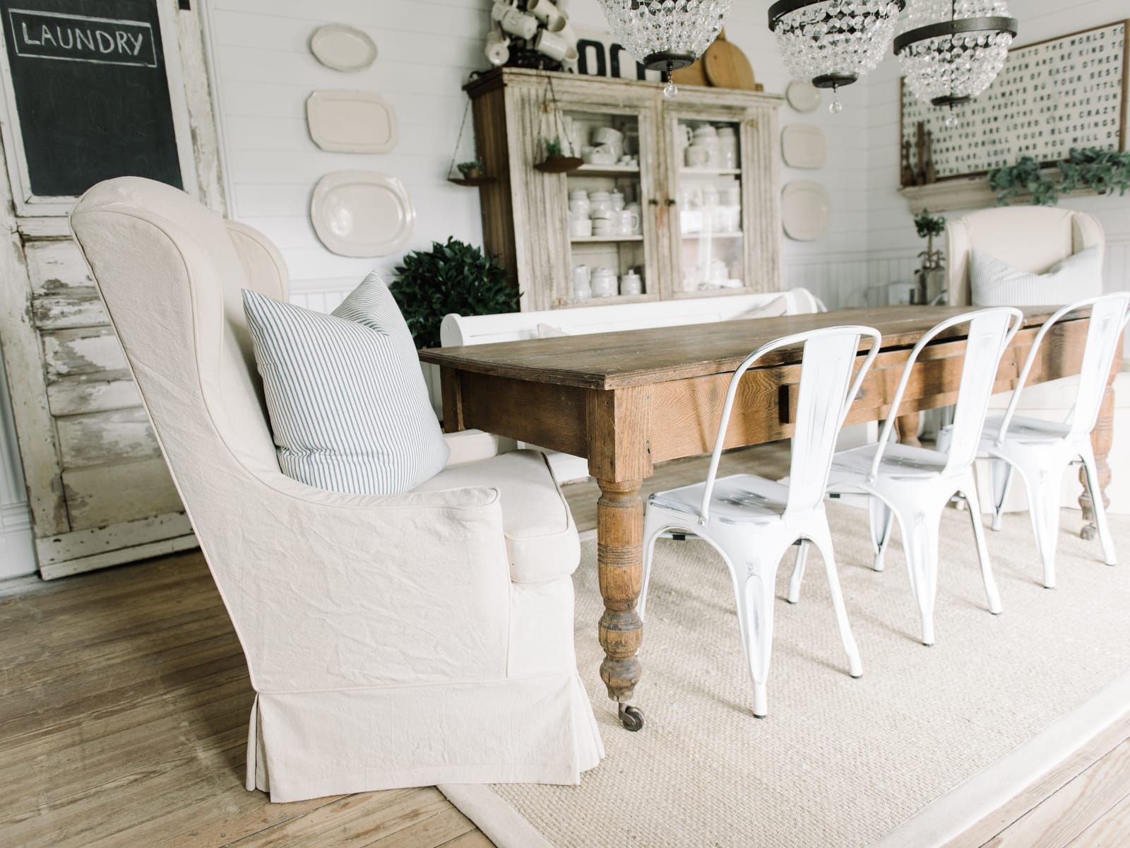 Jessica made the slipcovers from regular old drop cloths just like the rest of the sofas & chairs we’ve had done in our home by her. We love how durable the drop cloth is & the look of it as well. Also, it’s super cheap. I’m in love with how these turned out & how they add a little vintage drama in our dining room that I feel pairs perfectly with the long farmhouse table, crystal chandeliers, & large primitive cupboard in the background.