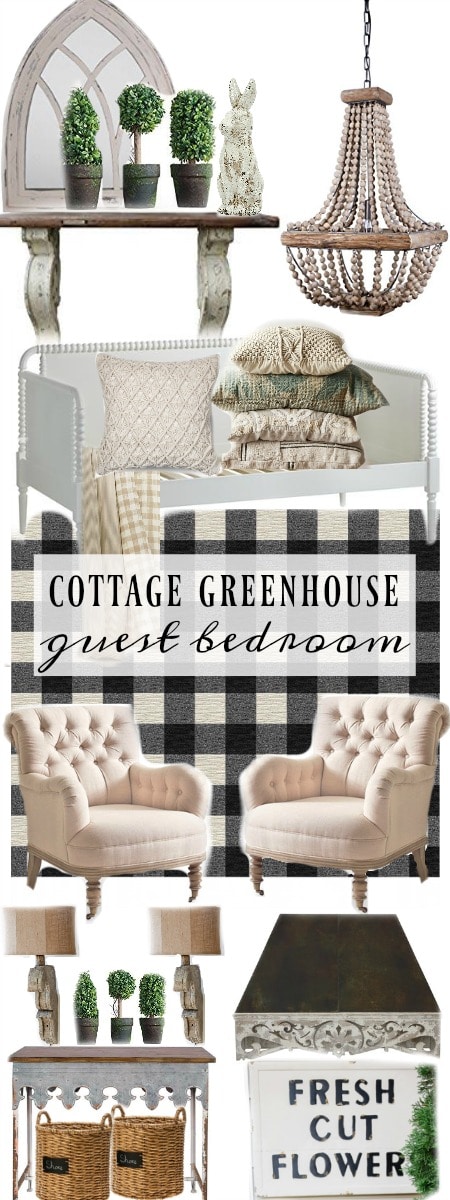 Want to know what’s really like me to do? To start a room without a plan. I seriously just realized I do it every time. Not when I’m assisting others with their homes, but when I’m doing my own.. I just start the demo process & fly by the seat of my pants. It’s the way I roll & I guess it works for me, but It’s hard to convey to others what I’m thinking when I roll that way. Well, we have the whole lower level guest bedroom torn up & I started painting it, so I thought I would share the inspiration board I just threw together for the space now that we have it all torn up. Because why would I have this plan when I started? If you follow me on Instagram [HERE] I’ve been sharing tons of house progress in my Instagram stories & I’ve been sharing lots of video updates as I work in that room.. I’ll be sharing more of the process on here soon, but for now I just wanted to share a little bit of what is in my brain as far as inspiration here on the blog with you guys. I started with some carpet ties from Flor.Com & built off of there. I really wanted to bring a cottage greenhouse vibe to the space with buffalo check, lots of greenery, an awning over the window, metal accents, a white daybed piled high with cottage linens, & so on. This room will mainly be used as a sitting room, guest room, & also a workout room. So it will be serving a lot of purposes & I want it to feel inspiring, fresh, & full of life.