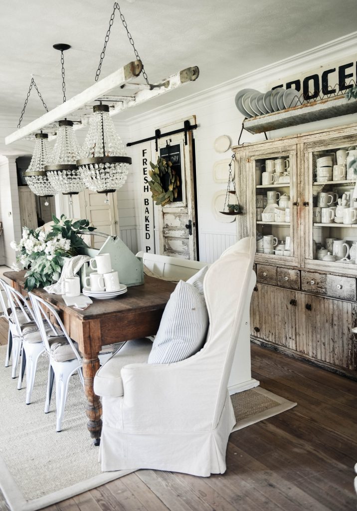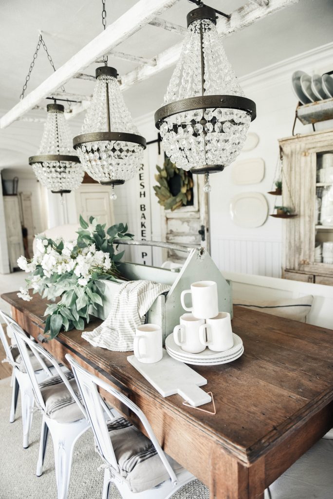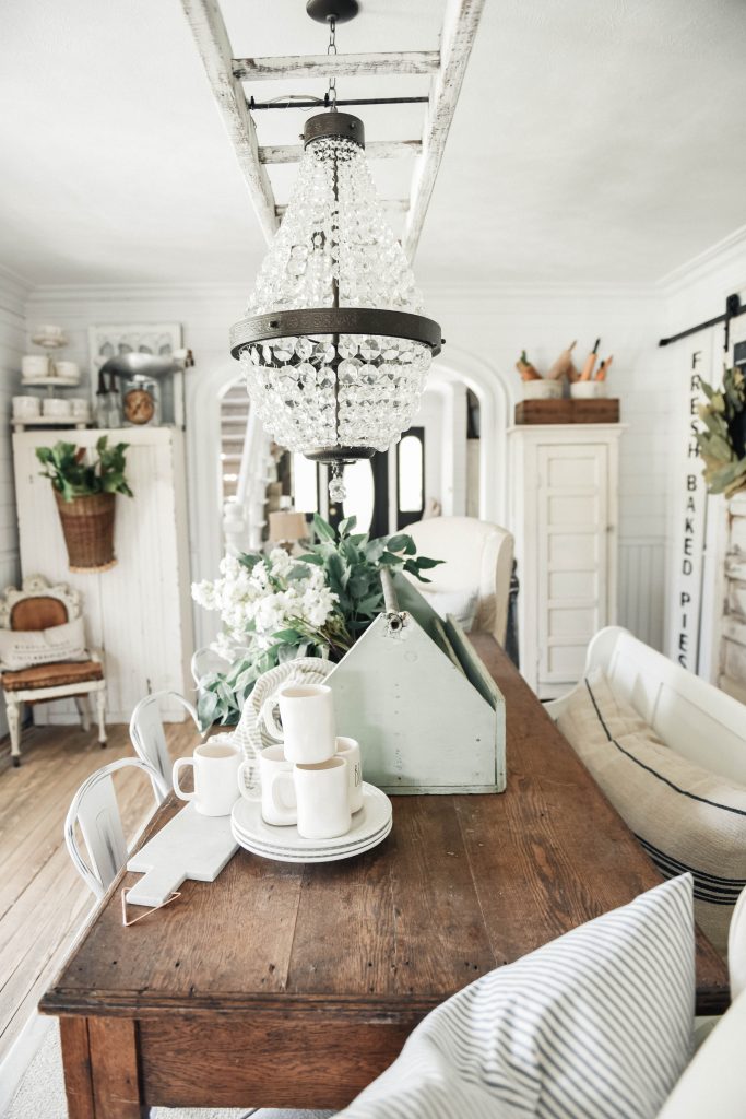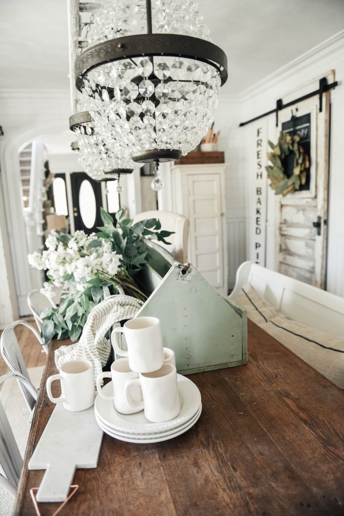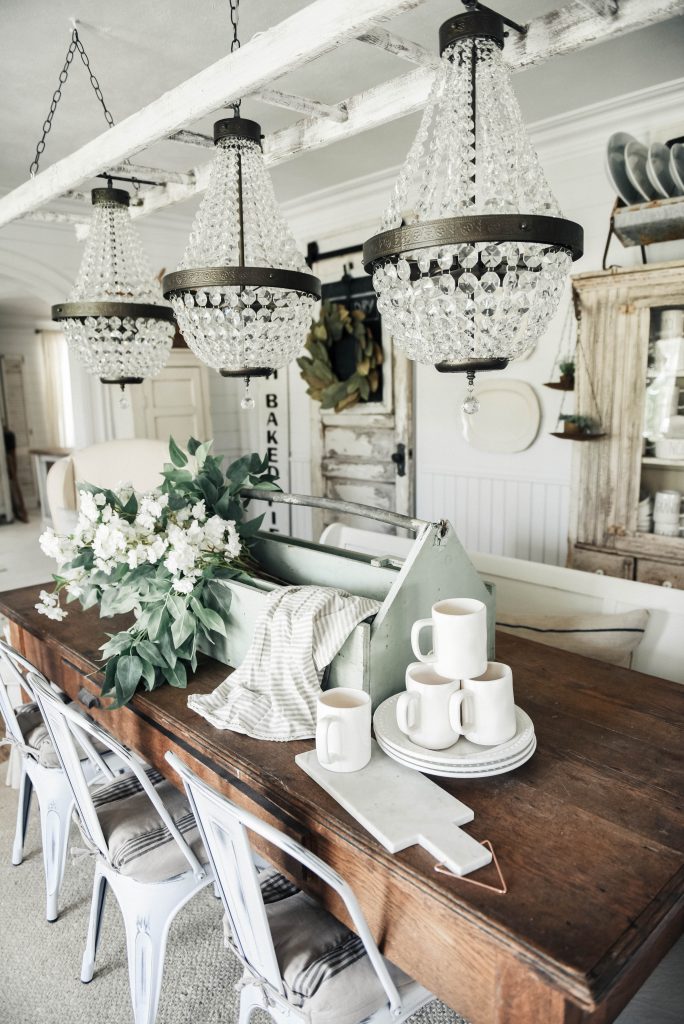 I have this love for antique tool boxes. & this one is massive.& it’s mint. This one is so big that I could hardly lift it… I mean, or farmhouse table is quite large & it takes a big chunk of the table. I guess you can compare it to the coffee mugs for perspective. If you remember our antique bottle centerpiece [here] than you saw these florals, I simply just removed them from the glass jugs & put the bundle in this antique tool box. You can’t get more simple that that folks… you just can’t. The nice thing is you can easily remove the centerpiece by simply taking the toolbox off the table.. if you can lift it. You can find antique toolboxes at your local thrift stores, vintage stores, & more. If you can’t find one, you can DIY one. I just love the simplicity & the laid back vibe of this spring & summer centerpiece.