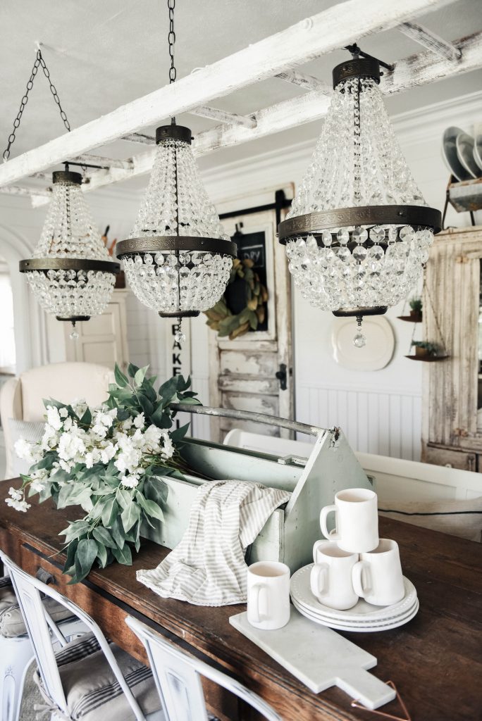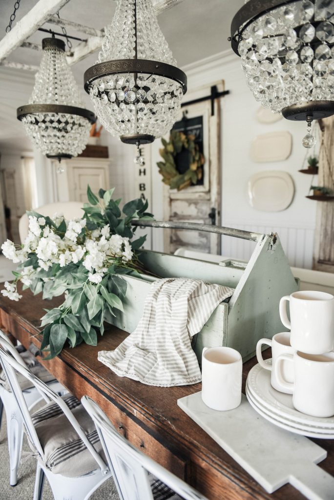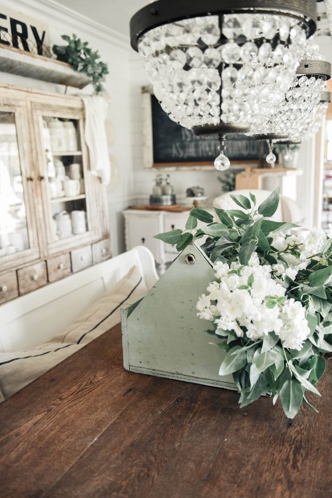 You guys know I love to switch things up a lot. Like a lot a lot. re-decorating & playing with decor gives my brain a little break after a long day at the shop. Sometimes it’s a big change & today’s centerpiece isn’t. I literally took greens out of jars that were on the table & put them in my new vintage tool box I picked up at our shop the other day. The Family roost, who are vendors at our shop The Found Cottage, brought in this mint tool box & as soon as it came in the door I knew it wasn’t going to go out on the floor. I was taking it home with me…