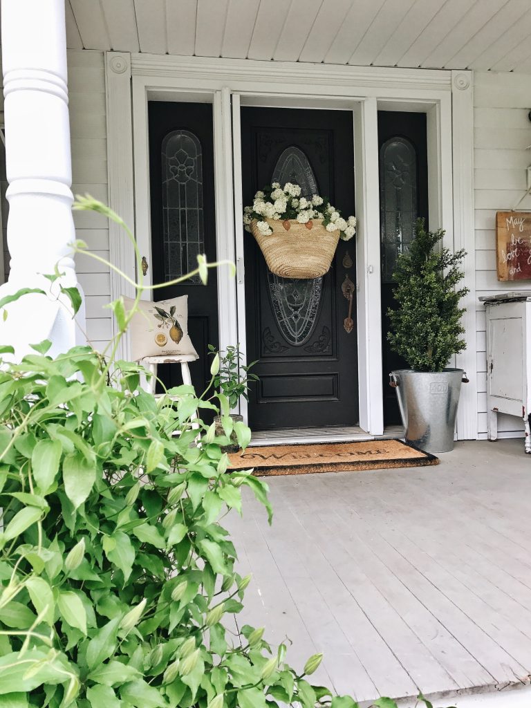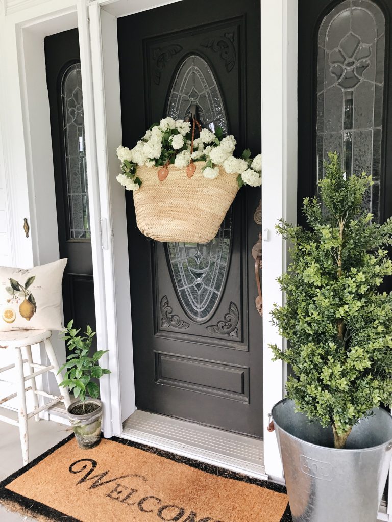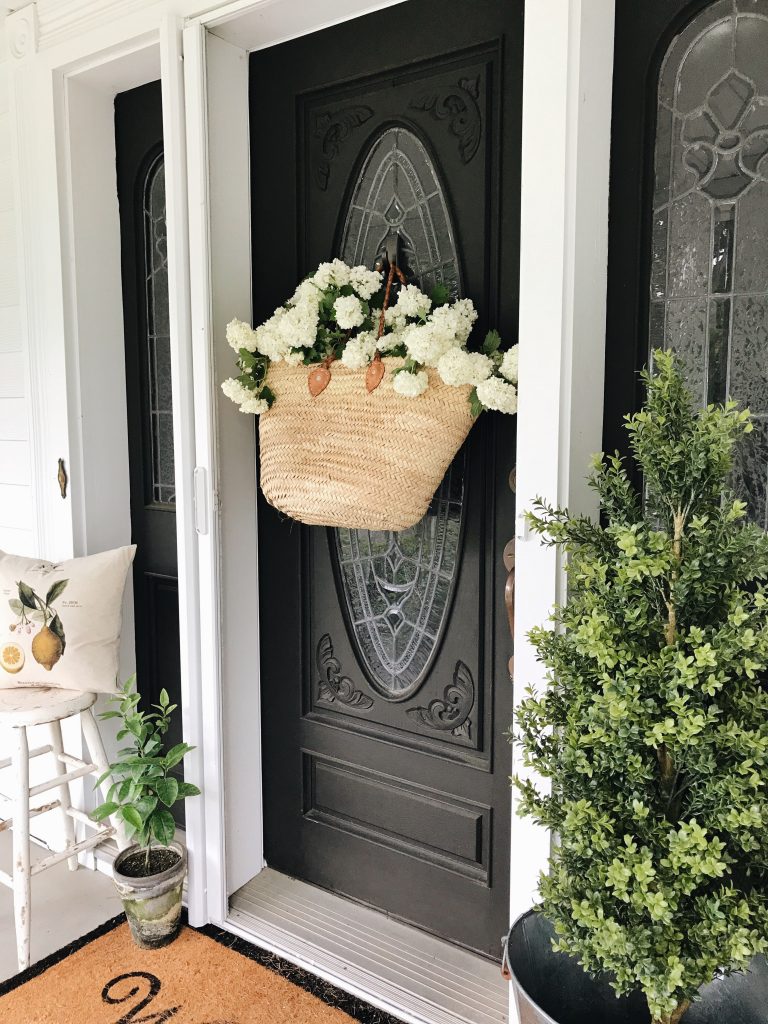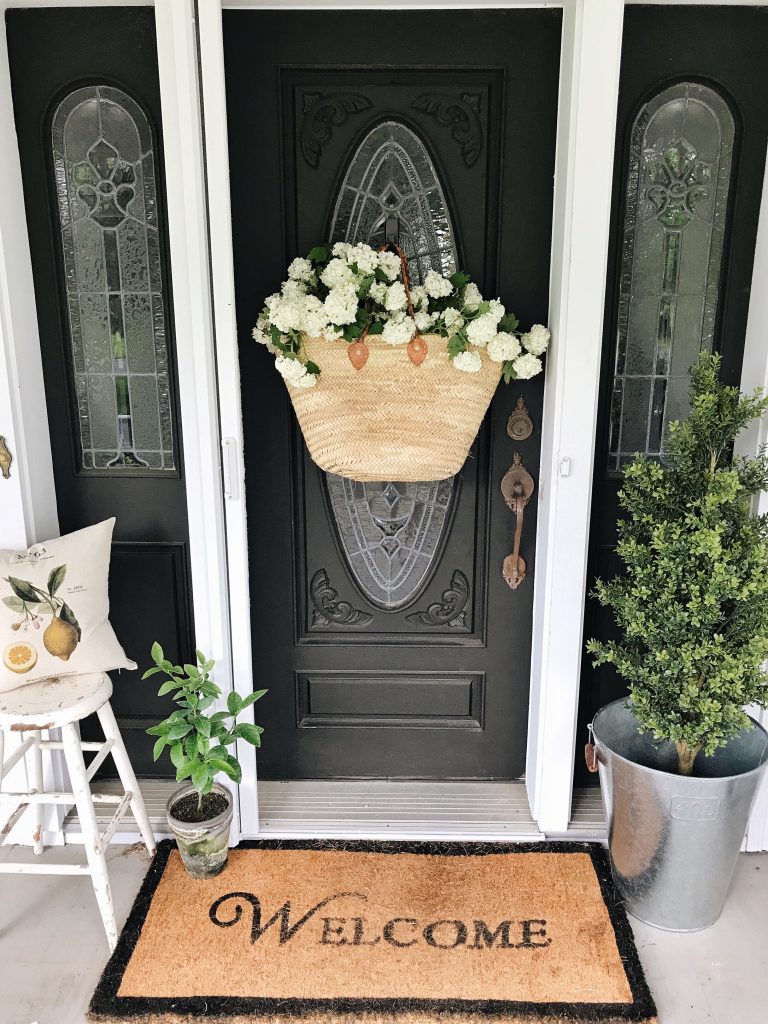 I don’t really share this area of our house much because it’s about to get a huge facelift. New front door & new windows & also Jose wants to paint the porch, but more on that later. For now we made our door look cute for spring in as much time as it took to clip some florals in our yard. To hang the market bag on the door I used a simple 3M hook on the glass. I filled the bag with fresh florals from our yard which you could put an oblong vase inside the market bag with water for the florals, but I simply placed them in the bag to enjoy for two days. I will most likely be putting faux florals in the market bag after these are gone so they are low maintenance & will stay pretty for as long as I leave them up here. & don’t you think this little lemon pillow from Linen & Ivory goes so well out here on our porch? I’m a little obsessed with it so I’ve been styling it all over our house. I also styled this little space with my little lime tree that I’ve somehow kept alive & that faux boxwood tree & planter from Ikea [HERE].