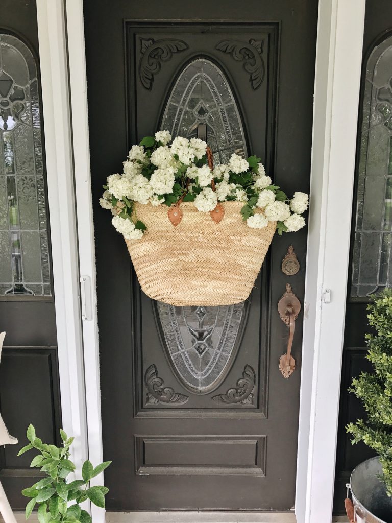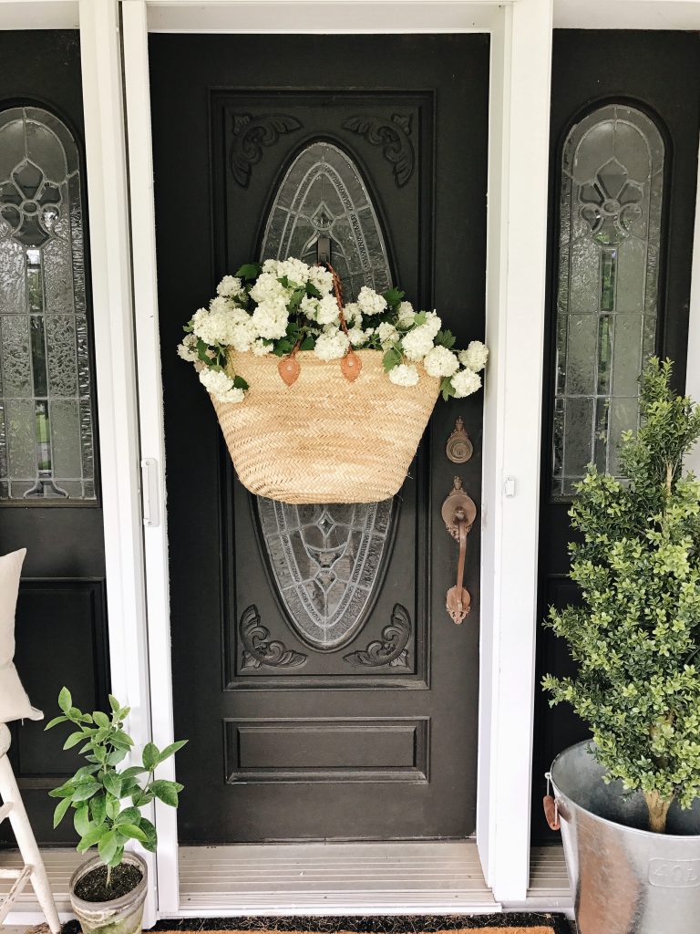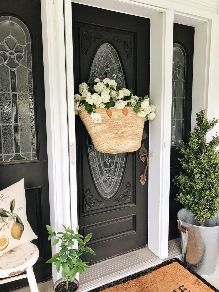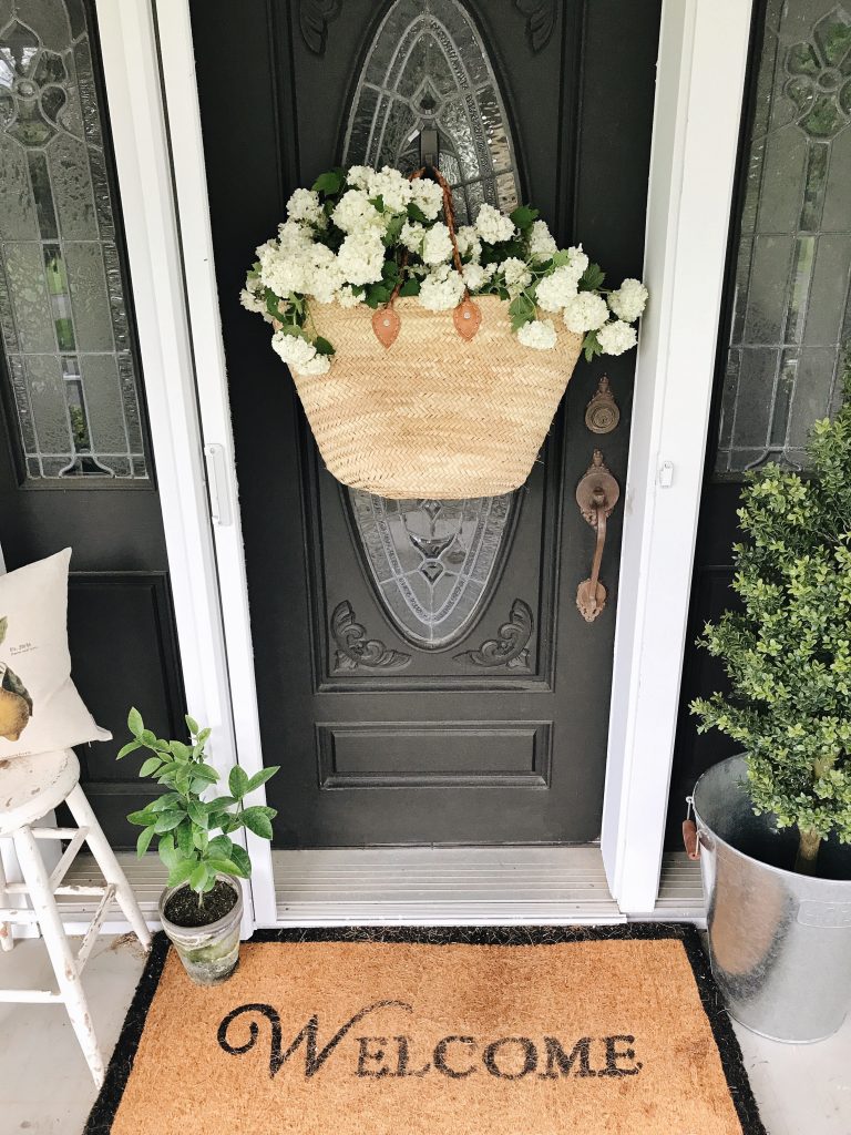 The term “DIY” is used loosely here. Very loosely. I mean, unless you call buying a market bag & collecting flowers out of your yard a DIY… well, now that I think about it. That is a DIY project & I’m pretty proud of it! Also, I didn’t feel like making a wreath for our front door & couldn’t find a wreath that I loved for this space, so this will do for now! It all started when I was at the shop the other day & I spotted this market bag hanging on a vintage bike we have there. I was thinking I needed it for something, but couldn’t quite think of where I needed it. I was thinking hanging in our entryway would be super cute on a coat rack, but that isn’t hung yet so I kept thinking… what about on our front door? & it’s adorable if you ask me….