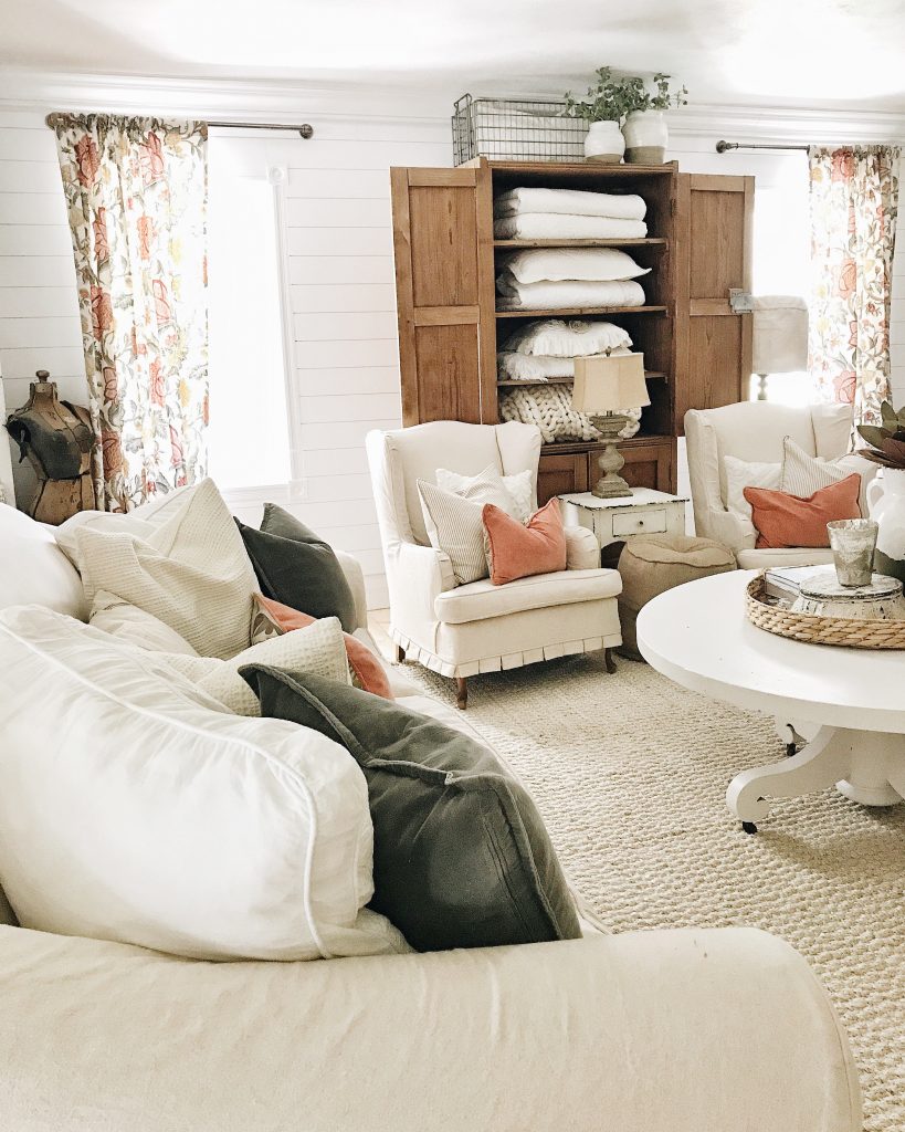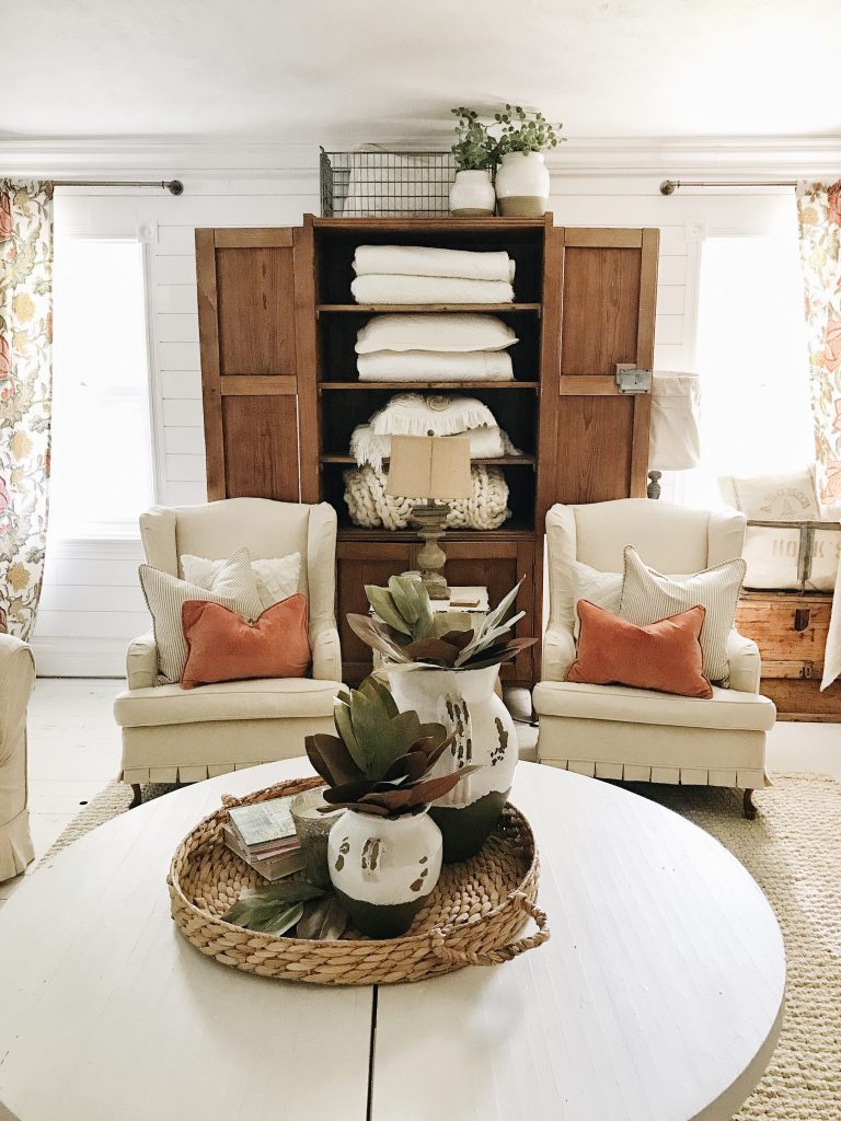 Tuned into your blog and was I surprised! Your living room is almost identical in layout as mine. My sofa is closer to the fireplace and the two chairs flank my fireplace. I, too, have an antique wardrobe in the exact same location and a dry sink backing up my sofa. However, my color scheme is a complete opposite with pumpkin and turquoise as the dominant colors and plenty of wood backed up to a creamy white background. Our curtains are almost the same! Great minds think alike!