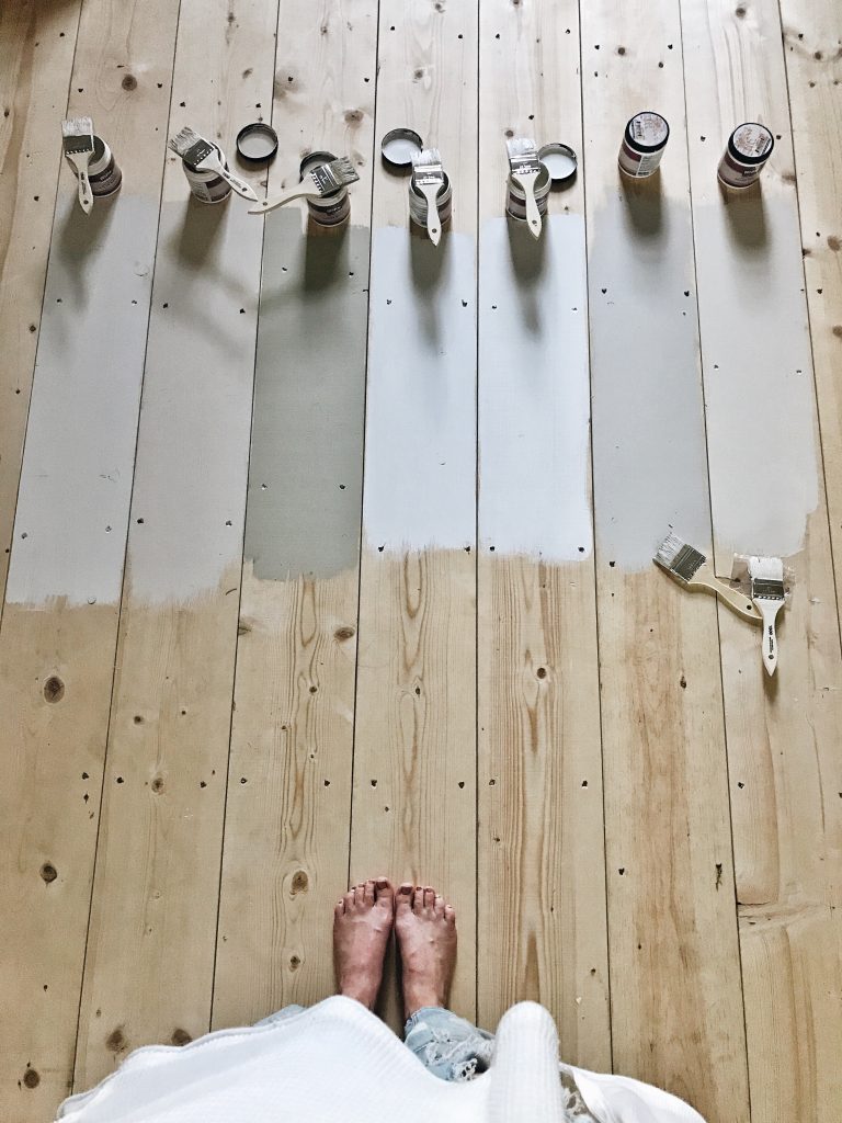 Here are the paint swatches on the floor far away and a little closer up. Now of course these paint colors are going to look so different at different times of day, but this was around 7pm at night when the sun is shining pretty bright in this room so I thought it was a good time to capture the colors. This room also only has one very small window so the light is spread evenly, but you get the idea. Well, out of these 7… I love just one. & I love it hard. Farrow & Ball Lime white is where my heart is at. It’s a taupey white that is a little warm, but not too warm or yellow. I think that this color would actually look great throughout our entire home with our white walls. By the way all these samples are in flat, but we would be doing more of a satin finish floor paint so that does change things a tiny bit & will add a little more life to the colors. All the colors are great in their own way, but I really love the lime white the best. I feel like the others are either too blue, too green, & just not what I was thinking. So here is test one. Round one. Phase one. Whatever you want to call it. I will be back with more paint & stain samples soon & possibly different photos from different times of the day to show you the difference that makes… I’m also thinking of doing larger areas of the floor with some of my favorite swatches to show you what they look like independently by themselves & in a bigger area. What do you think so far? What’s your favorite paint color so far for our floors? Let me know,I would love to hear from you! & thank you so much for stopping by the blog today!! xx