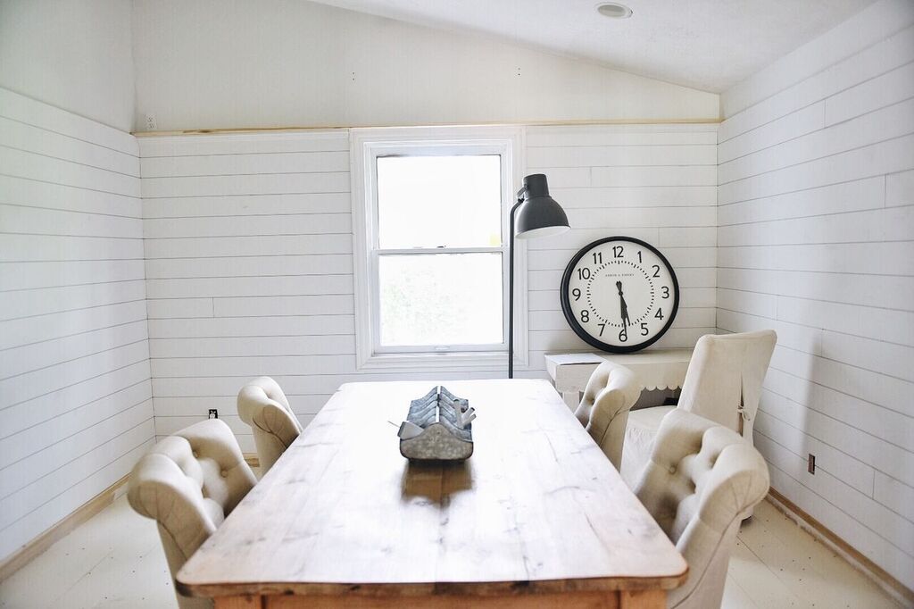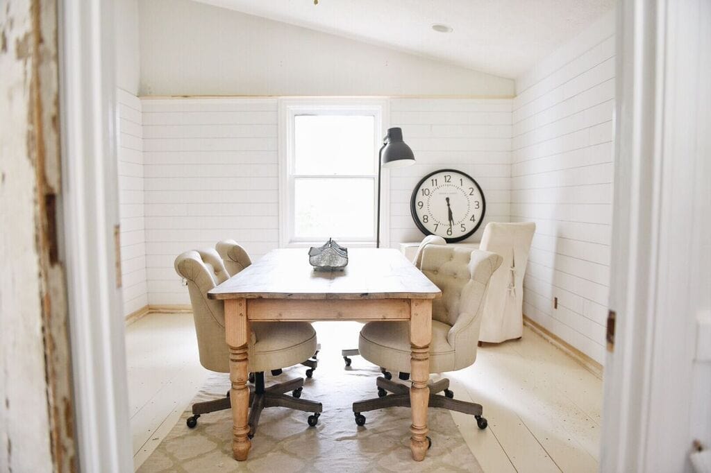 I am in love with your office space! It is coming alone beautifully! I just saw your story on IG about what color to paint above the shiplap in the office. I think a navy blue ( a darker blue) would look amazing with the white walls and the furnature you have in there currently!