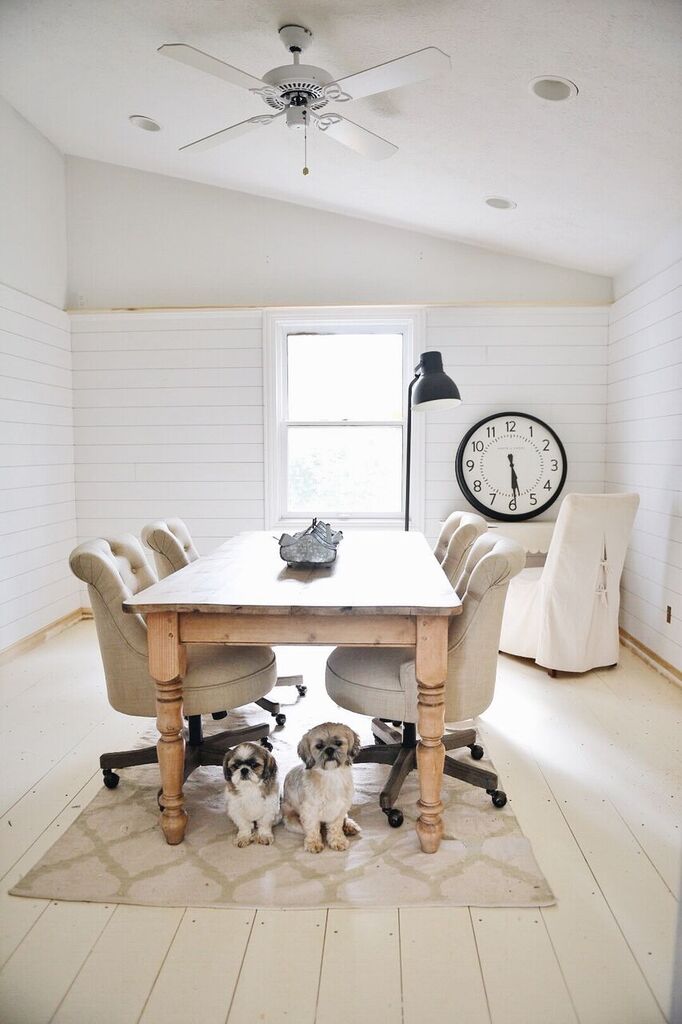 Our walls will be shiplap 3/4 of the way up with big bulky “shelf trim” to cap it off. We did this because of the walls angle on one side of the room & I’m really liking the character it has added to the space. Once all the shiplap is up we can start painting the walls. The floor is already painted Farrow & Ball Lyme White & we will be adding a massive rug in the space as well to make it more cozy [this rug in the photos is only here for placement]. The table we used was my favorite antique pine table that was on our porch & I ordered these office chairs from World Market [HERE] & I’m obsessed with them. They are so comfortable & they fit perfectly around this table of ours. There is also two other work stations, one in the corner of the room & one in the closet. We are making the closet into a computer desk area that will hold our desktop computer and also the closet will be holding tools, supplies, & a lot more. Jose is working on the closet to maximize the space & so far it’s amazing, can’t wait to show you what it looks like when it’s done!
