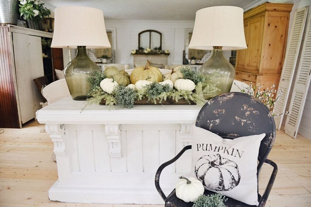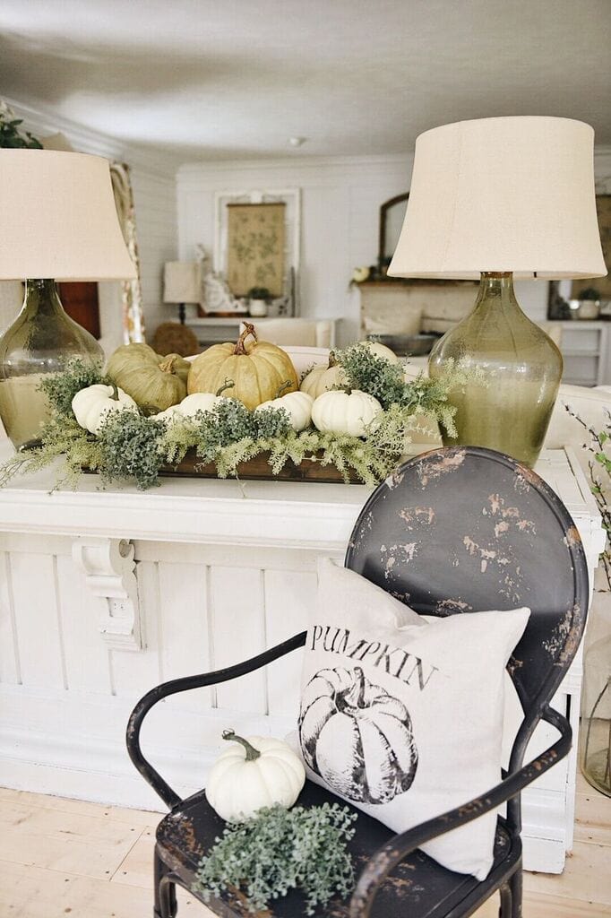Just a simple little cozy cottage pumpkin display in our front entryway to get this fall decor kicked off! You could do a centerpiece like this in any area of your home from an entryway as shown here, on a coffee table, a dining room table, a buffet, & so much more. It was really easy to create this centerpiece and you could totally improvise with similar items to put your own twist on it. Ok, so what did I do? I started with a wooden tray that I had lying around. This one has a mesh bottom, but you could use any old crate or tray that you have. I then started layering pumpkins in the tray. Some of the pumpkins were from our store & a lot of them are from Michaels as well [they usually have a great pumpkin selection with coupons available as well which is nice. You can also find great fall stems like these from Michaels or Hobby lobby as well.] After I had the pumpkins generally where I wanted them, I started sticking floral stems between the pumpkins to add some texture & life to the vignette. I styled this area two ways. One way I added a black metal chair with a pumpkin pillow from old thyme market place & did a more simple centerpiece & the other way I did with just the centerpiece but added some garden metal to make it a bigger statement on its own. It was honestly the most simple thing, but what better than a pile of pumpkins and some greenery to welcome fall?