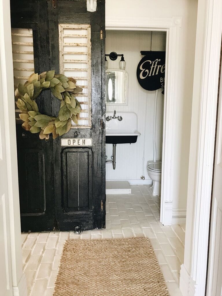 I like the black door. It had a more primitive feel and I like that it repeated the black and white theme of the bathroom. It is so unusual. The new door is nice, but not the show stopper the black door became hung and painted. It is a piece of art.