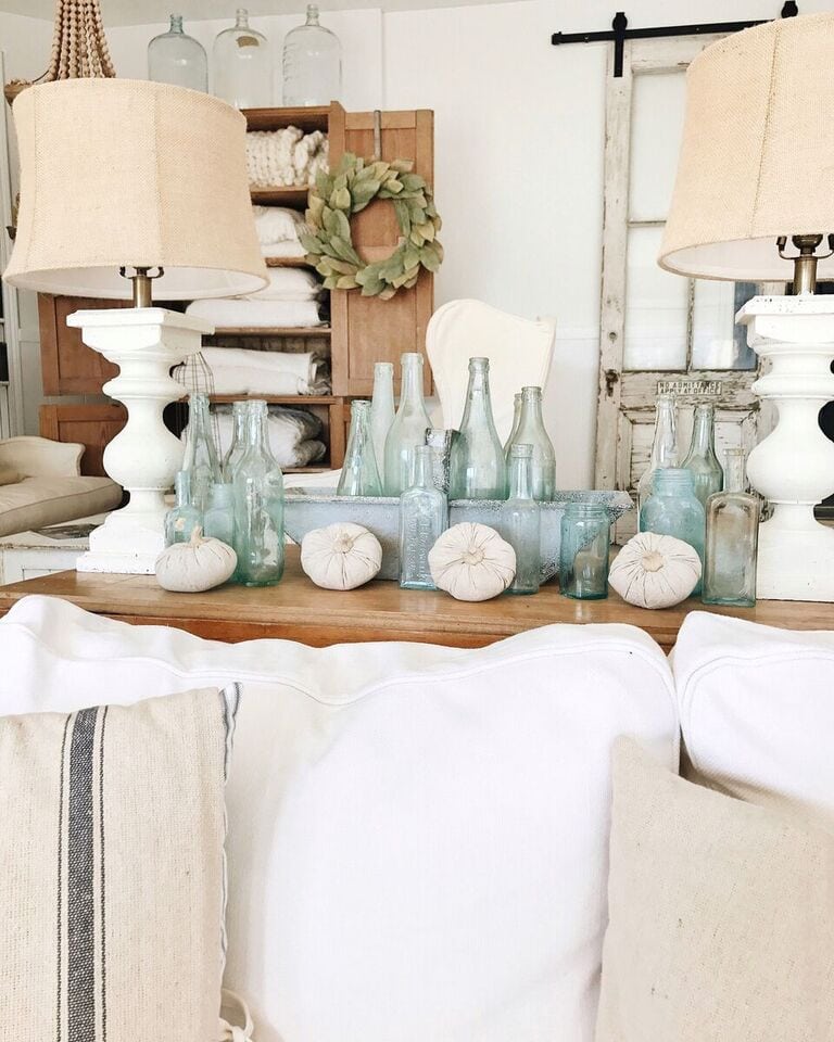 I picked up all of these blue bottles & these cute cloth pumpkins as well. I really never thought about using vintage blue glass in my fall decor, but I don’t hate it! Blue is always a good idea.