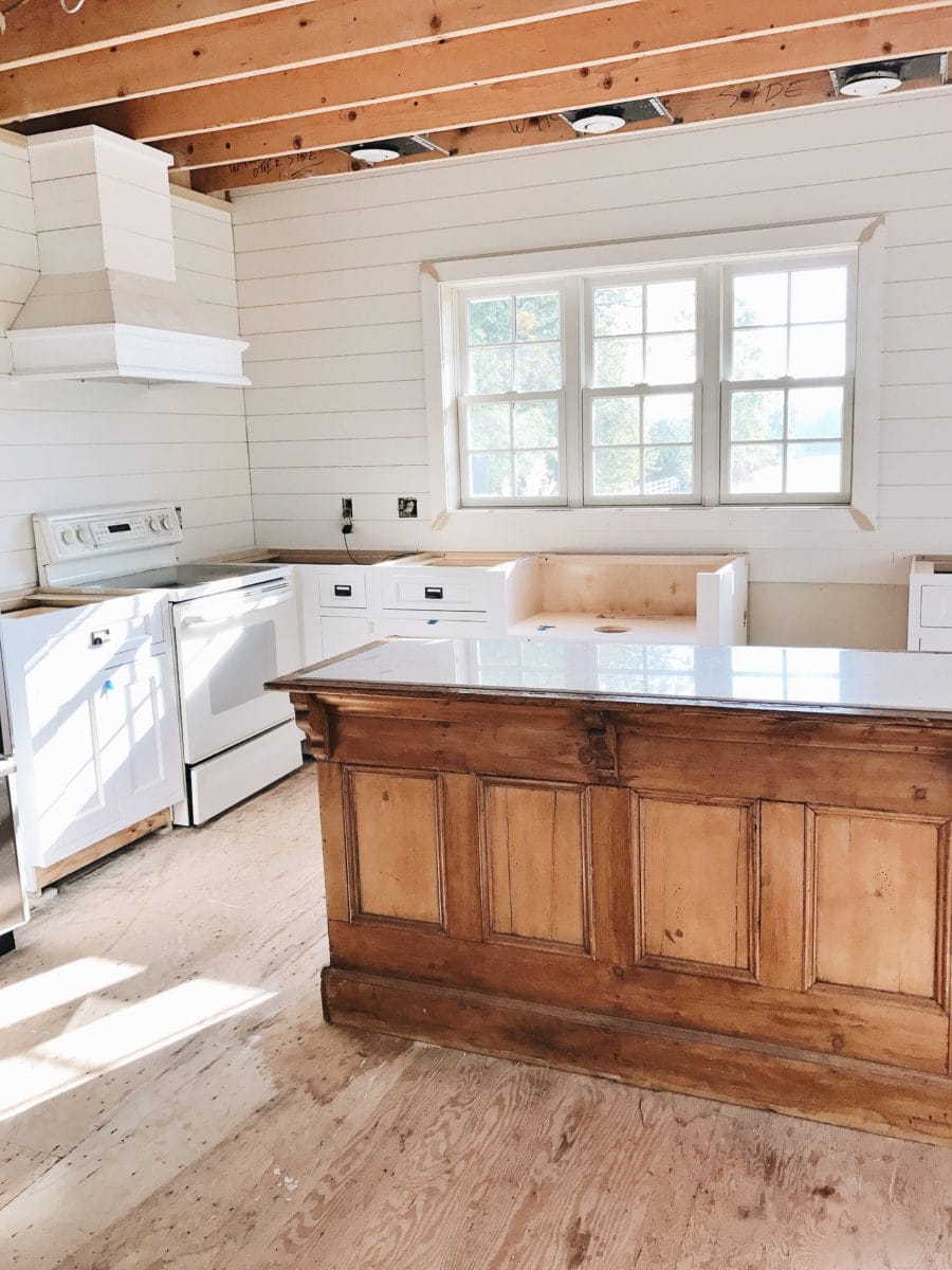 I love your cabinets and your shiplap walls! That island makes the whole kitchen!! I am still drooling over itl. I can totally picture it finished. Your white stove caught my eye… are you keeping it in this space? I have a 6 burner almond colored stove/oven with matching microwave above it, which I absolutely love, but it’s been keeping me from updating my cabinets to a creamy white. All the kitchens I see in white (or off white) have stainless steel so I’m stuck and frustrated by it. The pictures with white cabinets and white appliances don’t look well because the whites don’t match close enough. If you’re keeping your white stove I’m anxious to see how your kitchen works with it. I love where you’re going with your kitchen. I’m so envious of your entire kitchen! Thanks for sharing so we can make our homes as lovely as yours! I look forward to more pics.