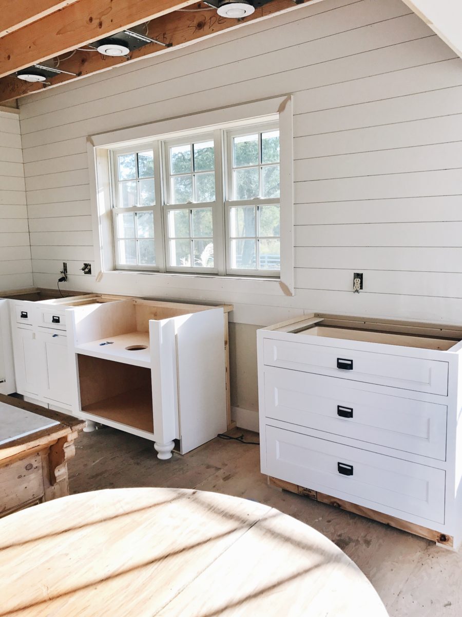 Oh my goodness I never thought I would see this day. We have kitchen cabinets you guys! Well sort of. They aren’t all in yet & they aren’t all finished, BUT it’s a start & I wanted to share that with you guys today. We wanted the kitchen to be super simple & have lots of those cozy cottage vibes that we love so much & to really let all of the windows in the space that look out onto our property to really take the center stage. So, this is what it looks like today before paint, counters, lighting, appliances, decor, & all of that fun stuff…