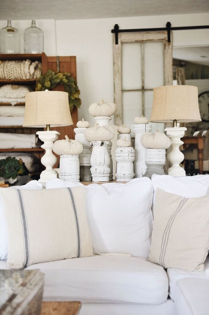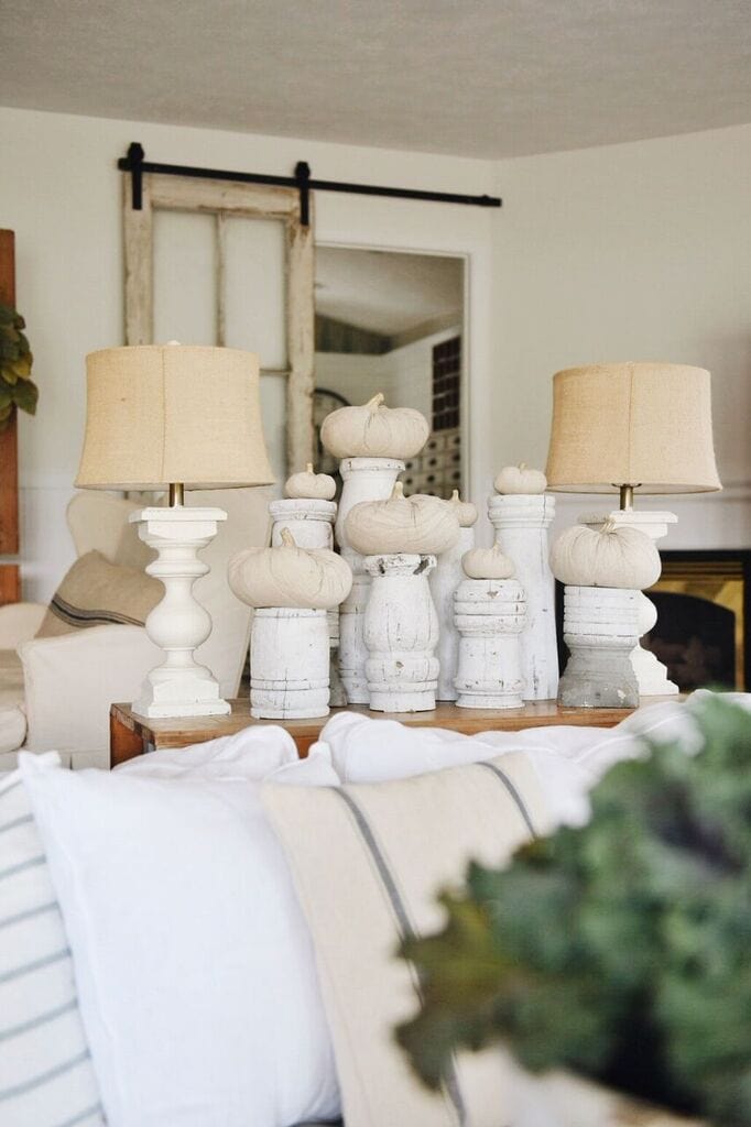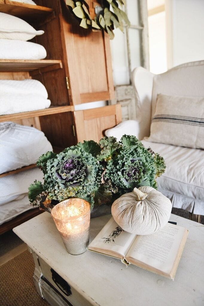 Jose made these white architectural pieces out of an old post & I was thinking of using them as candle holders, but I think putting a pumpkin on top of each one works as well. Cloth pumpkins just look good anywhere you stick them. Have an ugly table? Stick a cloth pumpkin on it. Have an plain piano? Stick a cloth pumpkin on it. It works every single time. I also incorporated ornamental kale into this room to give the space some life. I’m always a fan of ornamental kale in fall decor.