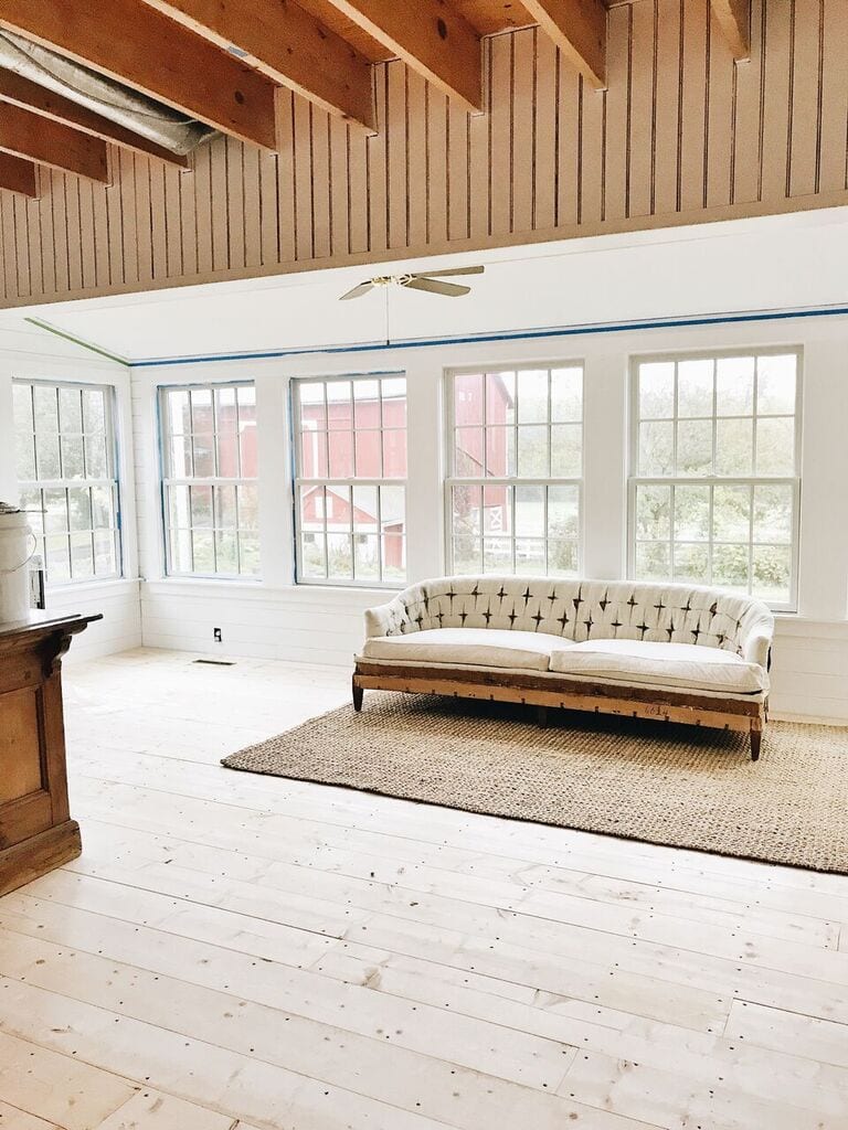 Today it feels like we finally made a ton of progress in the kitchen. You know, the one we have been working on since February. The floors were finally laid today and it was a huge step in completing the kitchen and sunroom area. We went with the same 8 inch pine planks that we got from West Michigan Lumber here local to us. & the same ones we went with in our dining room and front living room and this is with the progress looks like…