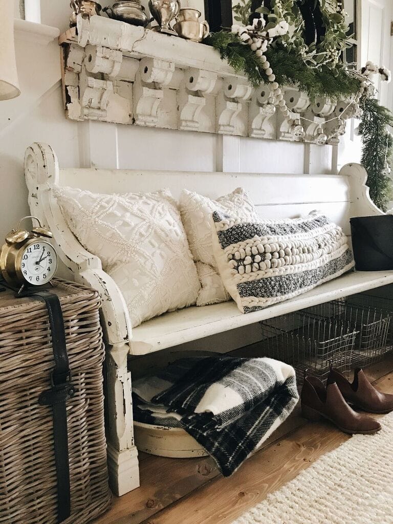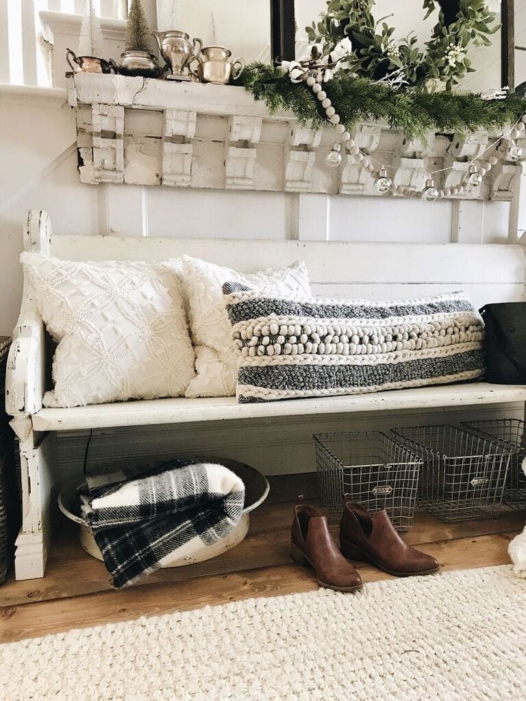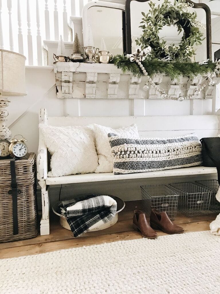 If you guys follow me on Instagram than you may have seen my stories this weekend where I was taking down this gallery wall in our front entryway. If you don’t remember that gallery wall, you can see it [HERE]. I know many of you loved the gallery wall in our front entryway & to be honest I did as well. It was one of the first areas of this home that we decorated & I loved all the pieces that made up the gallery wall. But I was really wanting to simplify this wall. The good news? We are going to use everything that made up the gallery wall in other ares of our house & I can’t wait to share that with you! Now you might be thinking that this doesn’t look to simplified, but it’s Christmas decor time so you know how that goes. But I promise this is more simplified! We basically took down the entire gallery wall & hung some salvaged corbels to create a large shelf that spans the staircase wall almost as long as the antique church pew. I will be sharing this space in more detail later when we get it all completely decorated for Christmas, but today I wanted to just share an update & the few finds that I got this week for our Christmas & winter decor.