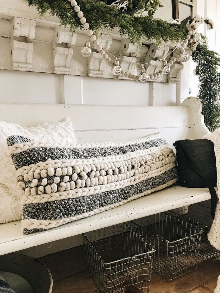 When all else fails to get me out of that dark space, that’s when Jose and I know it’s time to get out of the house for a little while… go on a date. Get out of our own heads. Have some fun. laugh a lot. Get inspired. & pray. So this past week when I was not feeling myself we went out on a date. We started at West Elm before we went to dinner & I found the more beautiful & coziest throw [HERE]. I mean, what comforts you on a cold rainy day more than a cozy throw? We made one more stop before our dinner date to Anthropologie which is one of our favorite “go-to on a sad day spots”. That’s where I encountered my dream pillow [HERE]. It was the perfect knotted wool lumbar pillow. I mean, I’ve never seen a pillow that was more beautiful and perfect a day in my life. We all know that pillows are my weakness, but as I walked towards the pillow I snatched it up and hugged it tight. It’s a massive pillow with amazing quality & I don’t even have to tell you how beautiful it is. Before we even left the store I knew where this cozy lumbar pillow was going to go in our front entryway and be the icing on the cake to all the big changes we have made there recently. & today I really wanted to share a sneak peek of those changes in the front entryway…