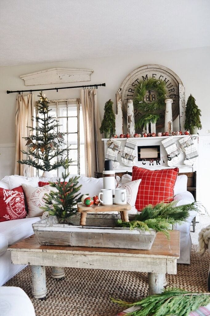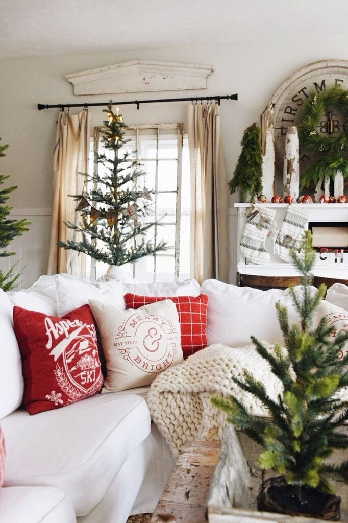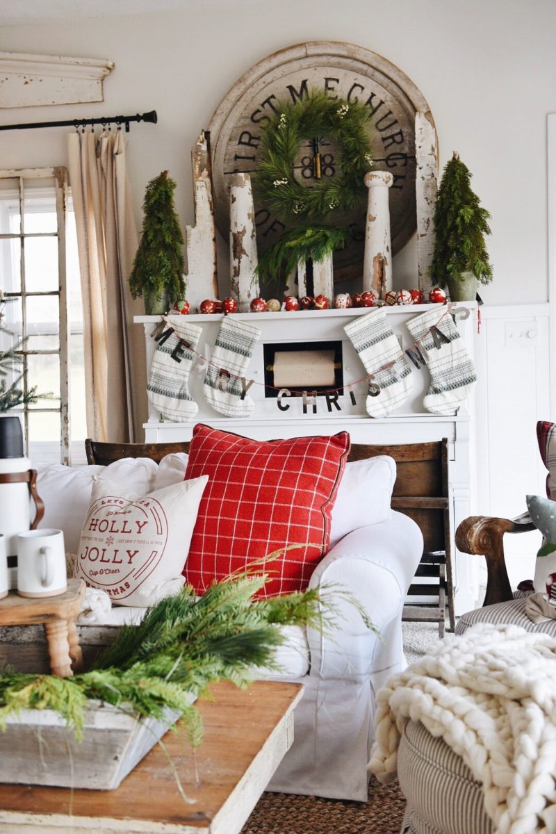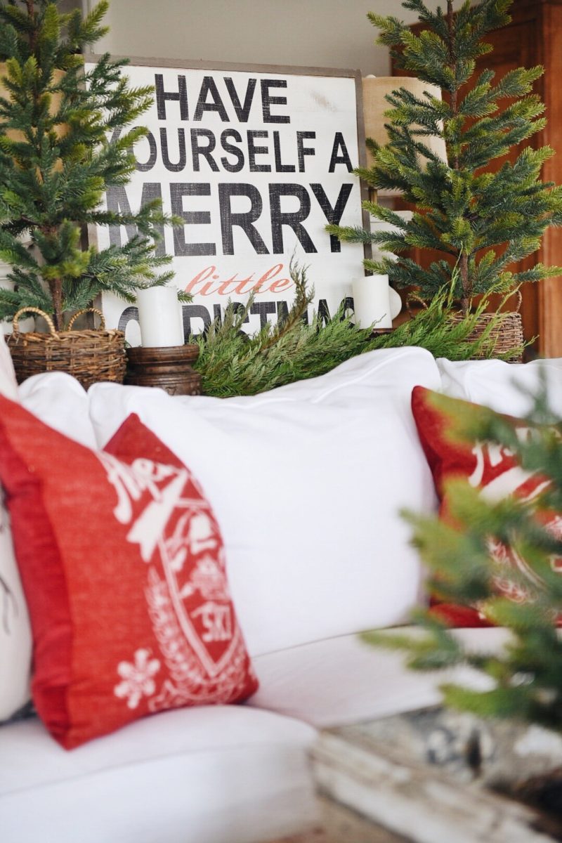 To get this look I focused on using the piano as our “mantel” by hanging the stockings [honestly I put push-pins into the top of the piano to hang them.. nothing fancy]. I spread some red & white ornaments at the top of the piano & hung a wreath from Target on the large architectural piece above the piano. Next to the piano I put our favorite Christmas tree on our little window bench we have there to add some height to the tree & make it more of a focal point. For the rest of the room I let the red pillows really speak for themselves & I put some Real Christmas greens around which I love for the look & that amazing pine smell!!