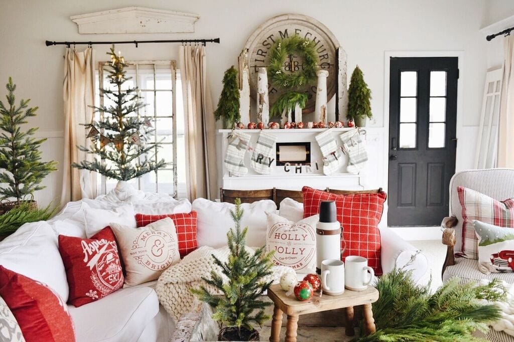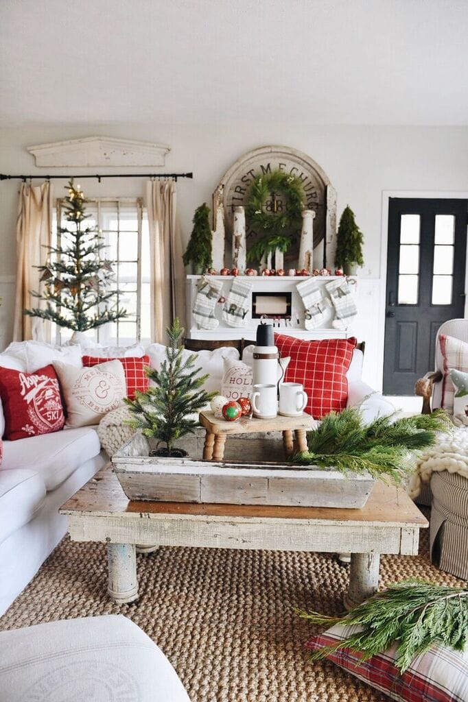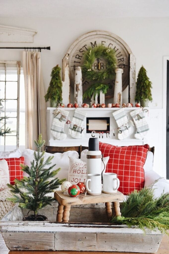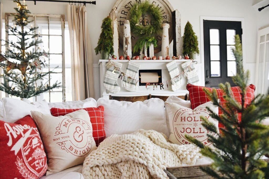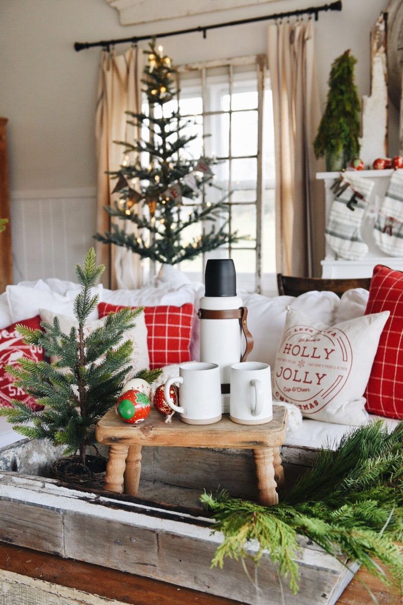 Most of these pillows were bought a few years ago like the Aspen pillows from Home Goods, the red check pillows from Target, & the word pillows from Linen & Ivory. The Christmas trees are all from Target [sources at the bottom of the post]. The plaid pillows & that Christmas car pillow are my favorites from Pottery Barn. They still make the car pillow [link at the bottom of the post], but they don’t make these exact plaid pillows with these colors which I wish that they did! The stockings the coffee items, & the Merry Christmas banner are also all from Target. Those cozy wool blankets are from Modern Wool & some of my favorite blankets to snuggle with in the winter.