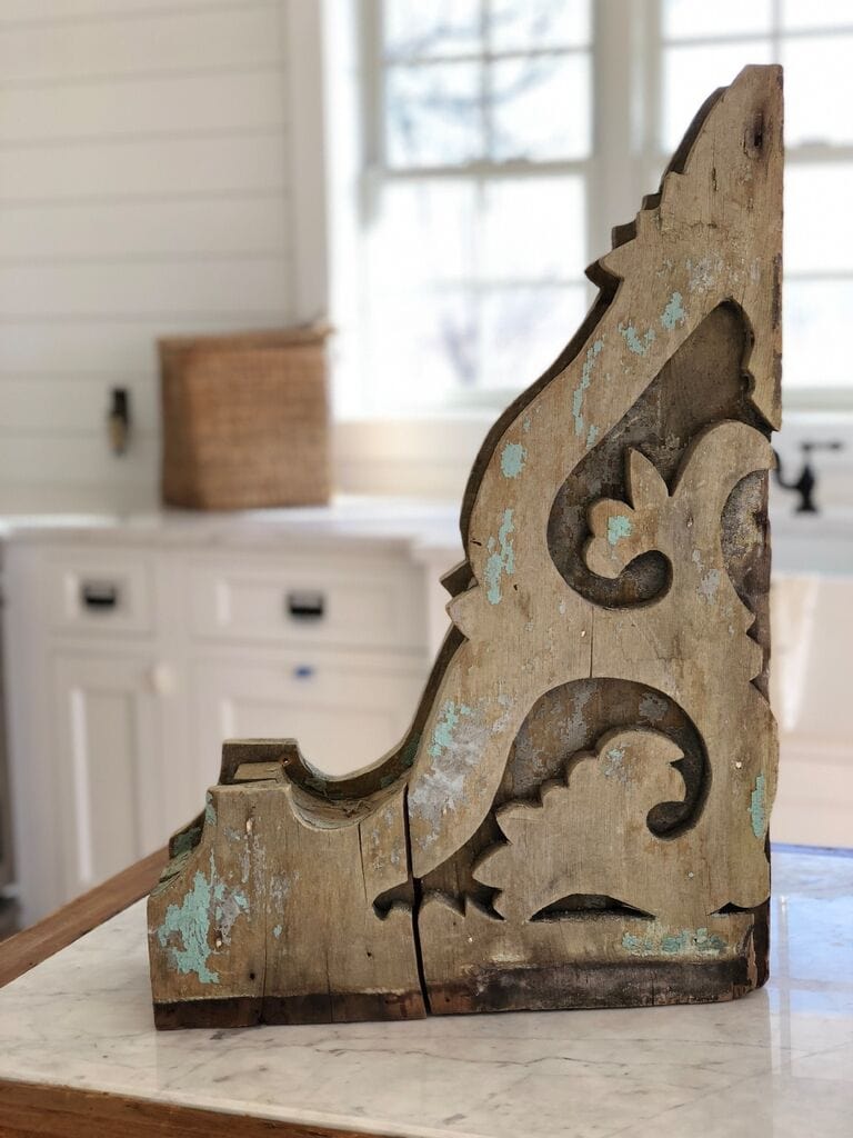 I wanted a corbel in our kitchen area, but the one that was the perfect size for the spot wasn’t really the color or look that I wanted. So I made it white & chippy myself. You guys know that I LOVE to have all the white chippy things from pieces of furniture to corbels & architectural pieces. You guys probably see them hanging in our house, but I rarely show how I have to fix, repair, & re-paint some of them to make them presentable. My secret? Milk paint. When I get a chippy piece sometimes it already comes chippy & white & just needs a few touch ups… milk paint. Sometimes the piece is chippy, but I want to paint the whole piece to give it a more solid look… milk paint. Sometimes I have to piece together a white chippy piece or match two pieces together… milk paint. The answer is always milk paint for me when it comes to chippy pieces. Milk paint accents the aged pieces & doesn’t hide it, it works with the wood & doesn’t mask anything, & it also allows you to be the artist with the paint & get the look you want. It’s a miracle paint & if you haven’t tried it.. it’s a must.