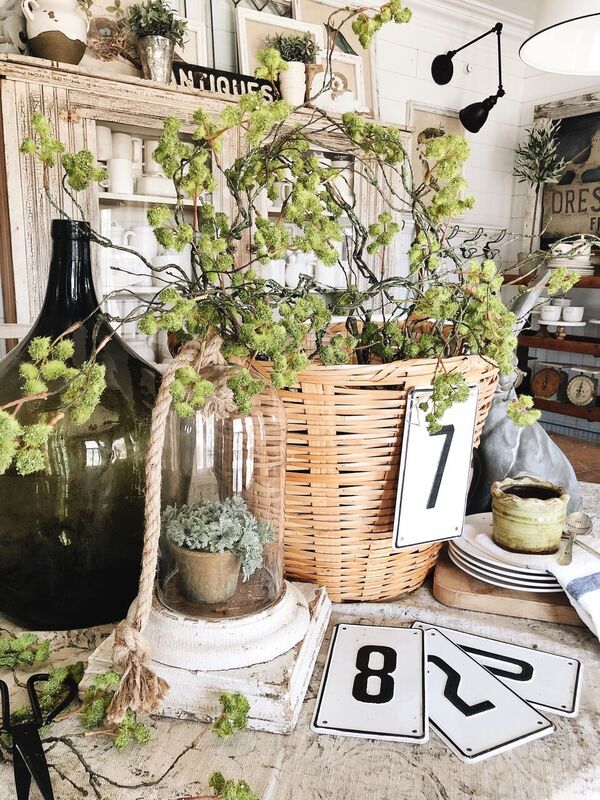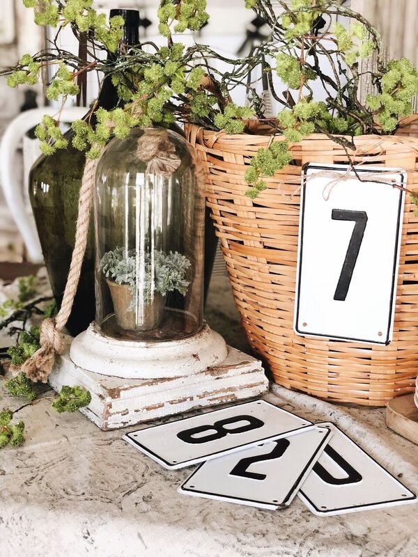 For this one in our dining room I put some branches in this basket from Pier One that I am obsessed with & hung a number on the front that I picked up at a flea market… This one is by far my favorite because of the textures & that pop of green.