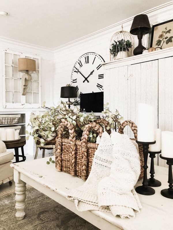In our front living room on the coffee table I styled this basket from Pottery Barn with some greens in it & a throw blanket as our centerpiece. I also paired it with some matte black candlesticks next to it for some more drama since this is a large coffee table. this is my favorite basket! I love how chunky it is.
