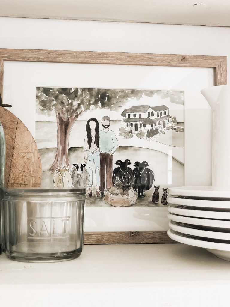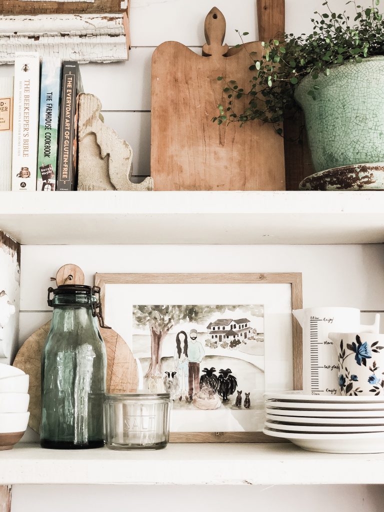 I am so in love with this watercolor painting she made for us that I placed it somewhere I looked everyday & right now that is on the shelves in our kitchen. It’s such a great family photo with all of our farm babies [minus Winnie: Funny story… she saw my announcement photo of us getting Winnie the night before she gave this to me & by that time it was too late. We had a big laugh over that one. I apologized. I would get a new puppy right when she finished a painting.] The best part about Joy working at our shop is watching her grow as an artist, find her niche, & be by her side cheering her on as we go. She just started selling her paintings & you can find her & contact her [HERE] on her Instagram. She’s a gem. You should get to know her… I know you will like her too! Ok, I’m done. I hop you guys liked today’s post & I’ll be back with a shelfie update soon… I actually have some exciting plans for it & can’t wait to show you what I’ve come up with. Thank you for stopping by today!!! xx