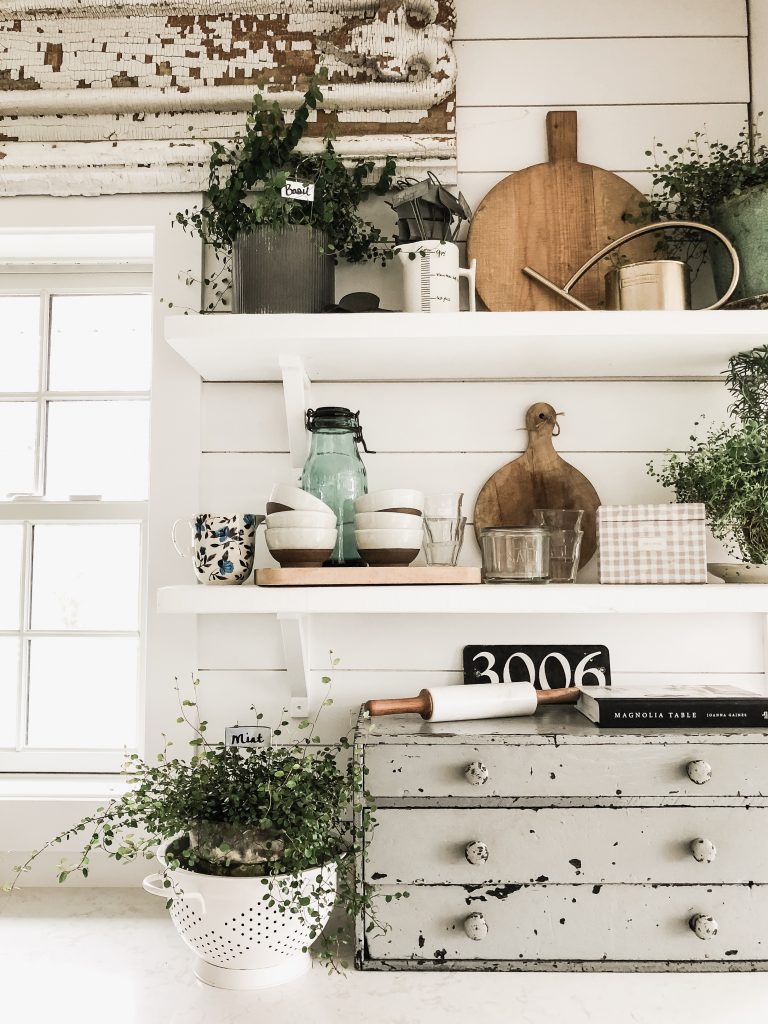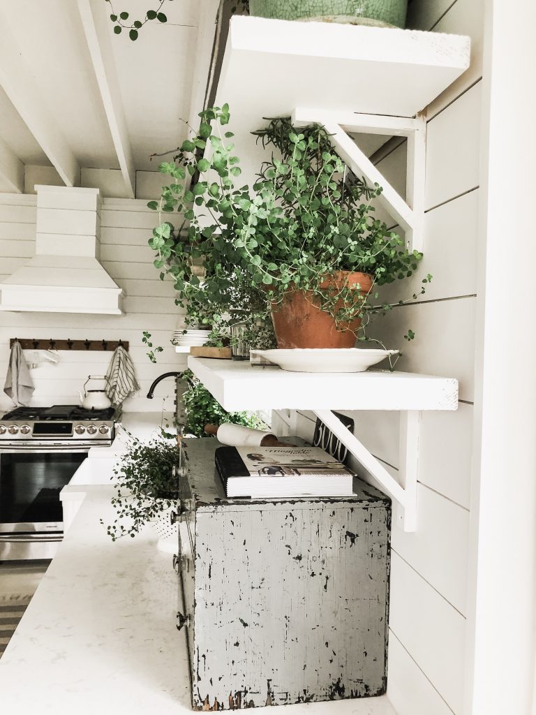 & we ended up loving it. It is useful, practical, pretty, & totally made our kitchen work. The problem? I didn’t have 4 more chippy corbels for the extra shelves so I had to come up with a new plan. The new plan? I ordered [THESE] Ikea shelf brackets. Do I miss the chippy corbels? I do… I loved them. But the best part about these shelves that if I ever find 8 matching corbels that are the perfect size & I feel like changing them, I can switch out the Ikea shelf brackets for the chippy corbels… it’s super easy & the shiplap backsplash makes switching things out super easy. These shelves are hung just like the corbel shelves were [we even used the same top boards], but we just changed to the Ikea brackets.