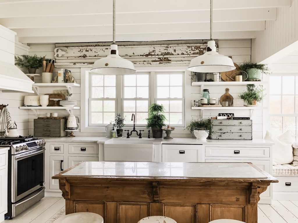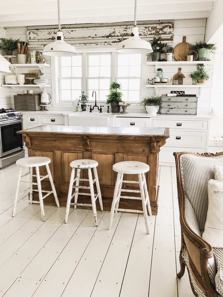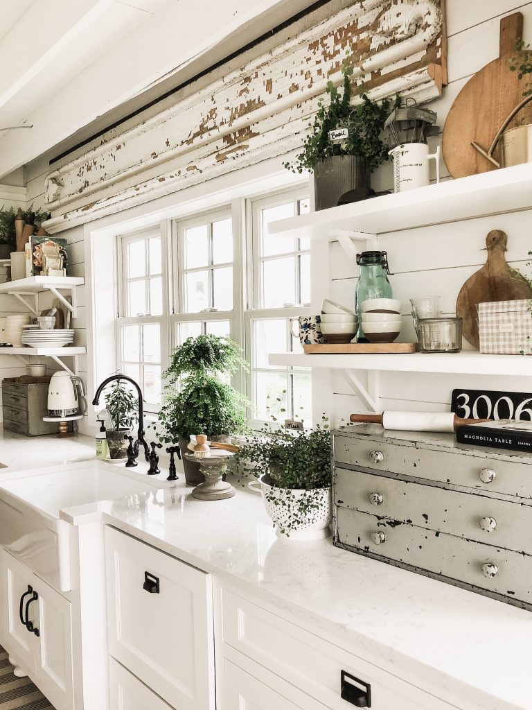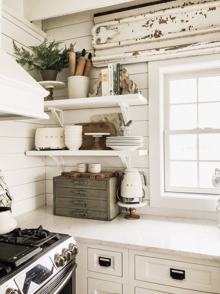 The current IKEA shelves integrate so much better in your kitchen because they are complete white and get one with the shiplap wall. So, all the deco stuff on it it’s totally eye-catching now.