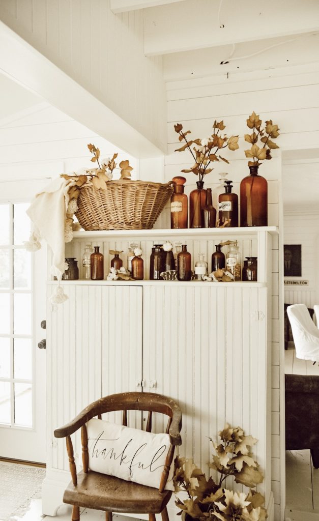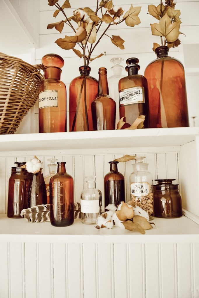 Love your amber bottles & fall home decor, neat space, happy fall yall??????????