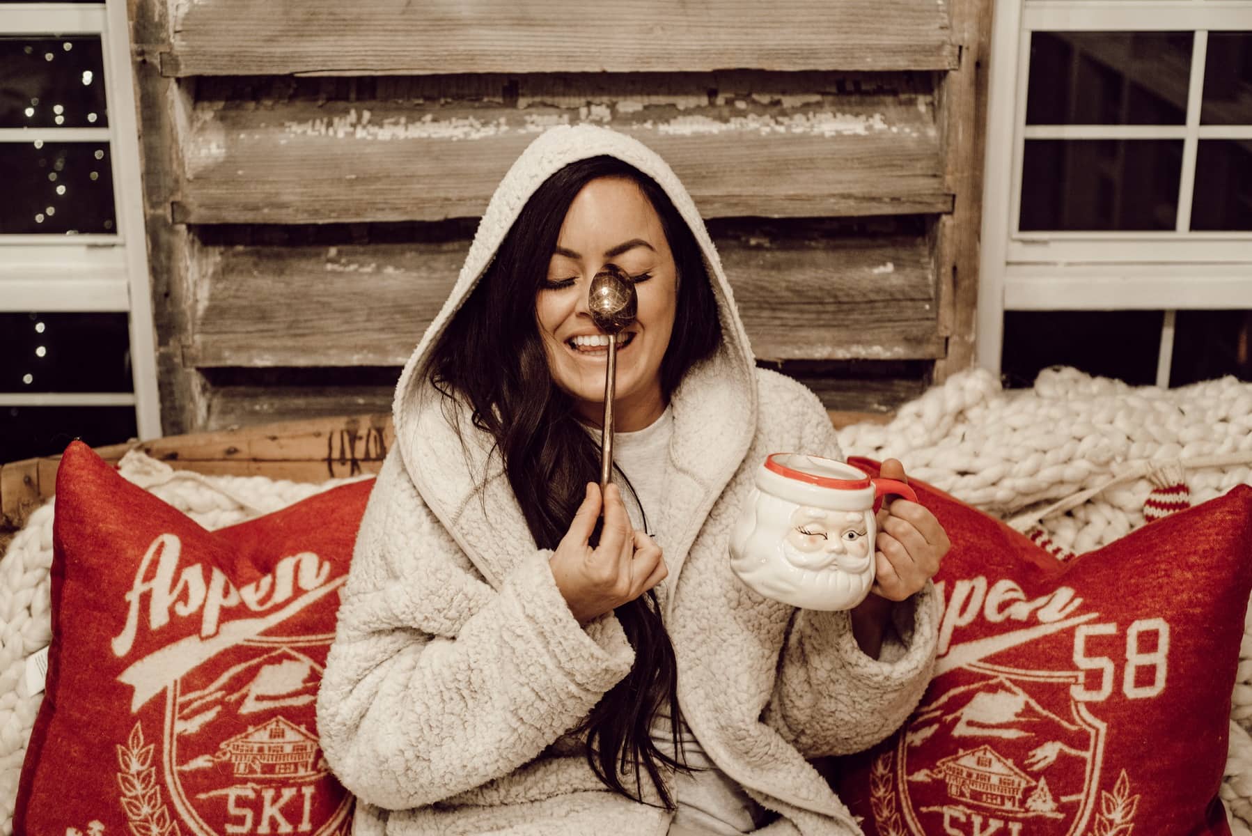 This greenhouse hasn’t reached it’s full potential or my dreams for it yet here on our farm, but it has been a cozy place to come and drink coffee [or hot cocoa]. I’ve made it a cozy place to be & to grow, but will hopefully be able to plant and grow many things for our farm soon. We came out here in our PJ’s last night when it was raining so hard & it’s such a beautiful sound on the roof of the greenhouse. We had the heater going and the hot chocolate brewing… It’s fun to come out here and sit & chat while being disconnected from the world. This weeks topic was all about our future baby. We talked about names & fun things we wanted to do with them and traditions we wanted to start when our family started to grow. We also discussed how lucky we are to have had so much time with the two of us that adding a babe now to the mix just seems so perfect. Maybe it was the hot chocolate, but my heart and soul were literally singing this night in the greenhouse surrounded by santa mugs, my best friend, and our dreams. I also laughed with Jose about how awful of a blogger I am to not have shared this space with you guys so he whipped the camera out and against my wishes took photos of me in my happy place not camera ready… but you know what? This is the woman I want my kids to see. Carefree, relaxed, in the moment, content, & happy….