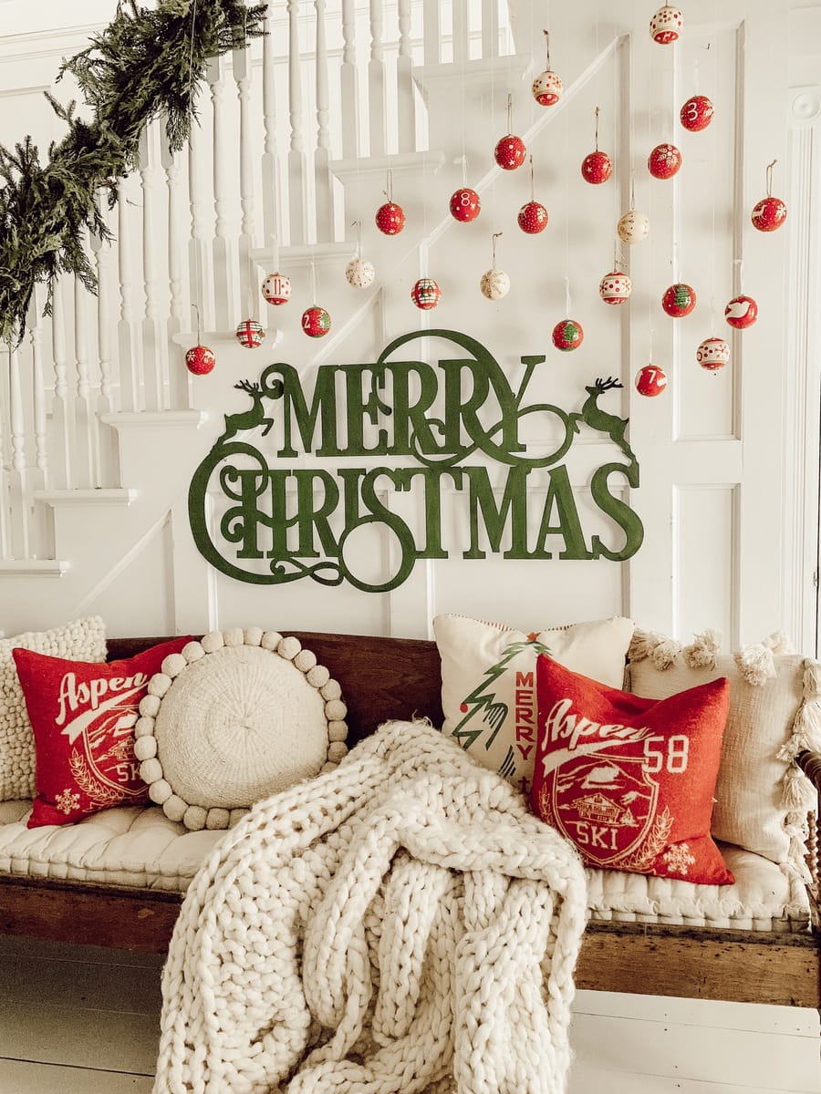 Yup, I spent an afternoon that I was supposed to be doing a million other things totally focusing on hanging ornaments from my ceiling because sometimes that is what my anxiety does to me, I can’t focus on my huge to-do list so I hyper focus on things that let me escape for a while. Some people nap when they are stressed, some people go and work out, & some people like me have to do something creative to get our anxiety in check. So what did I do? I wanted our entryway to give a festive welcome to our guests this holiday season so that is what I did by hanging some vintage inspired painted wooden ornaments I found at Home Goods a few years ago from the ceiling. I used string & a staple gun & stapled the string to the ceiling with the ornaments attached. Honestly I didn’t do any measuring, but all I did was just eyeball where I wanted the ornaments to hang. I used this metal “Merry Christmas” sign that I found at a local flower nursery that I gave a makeover to as my guide for where I wanted the ornaments to hang. The metal sign was silver before & I decided I wanted it to be more festive & bold so I painted it a green color & used a dark wax over the green chalk paint. For this look all you need is some ornaments, string, a staple gun, & a sign. You could use any color ornaments & you could use any sign from a wooden sign to a metal sign to any size sign. If you recreate this look be sure to tag me on Instagram so I can see it!!