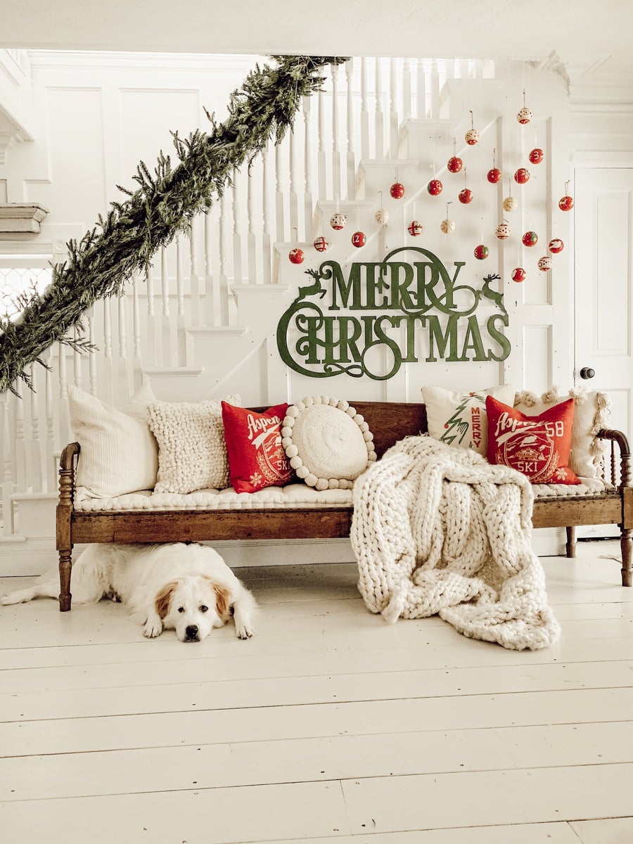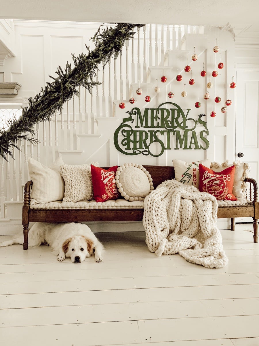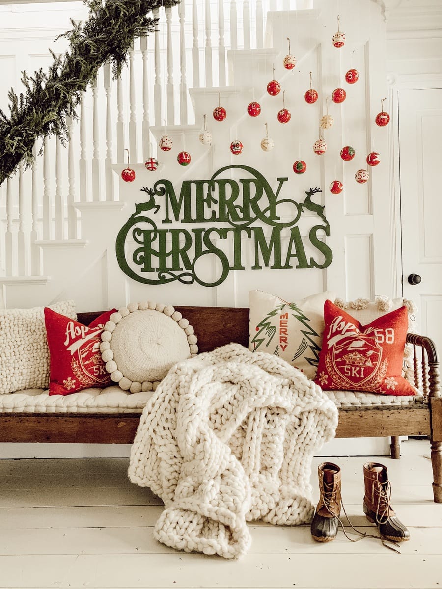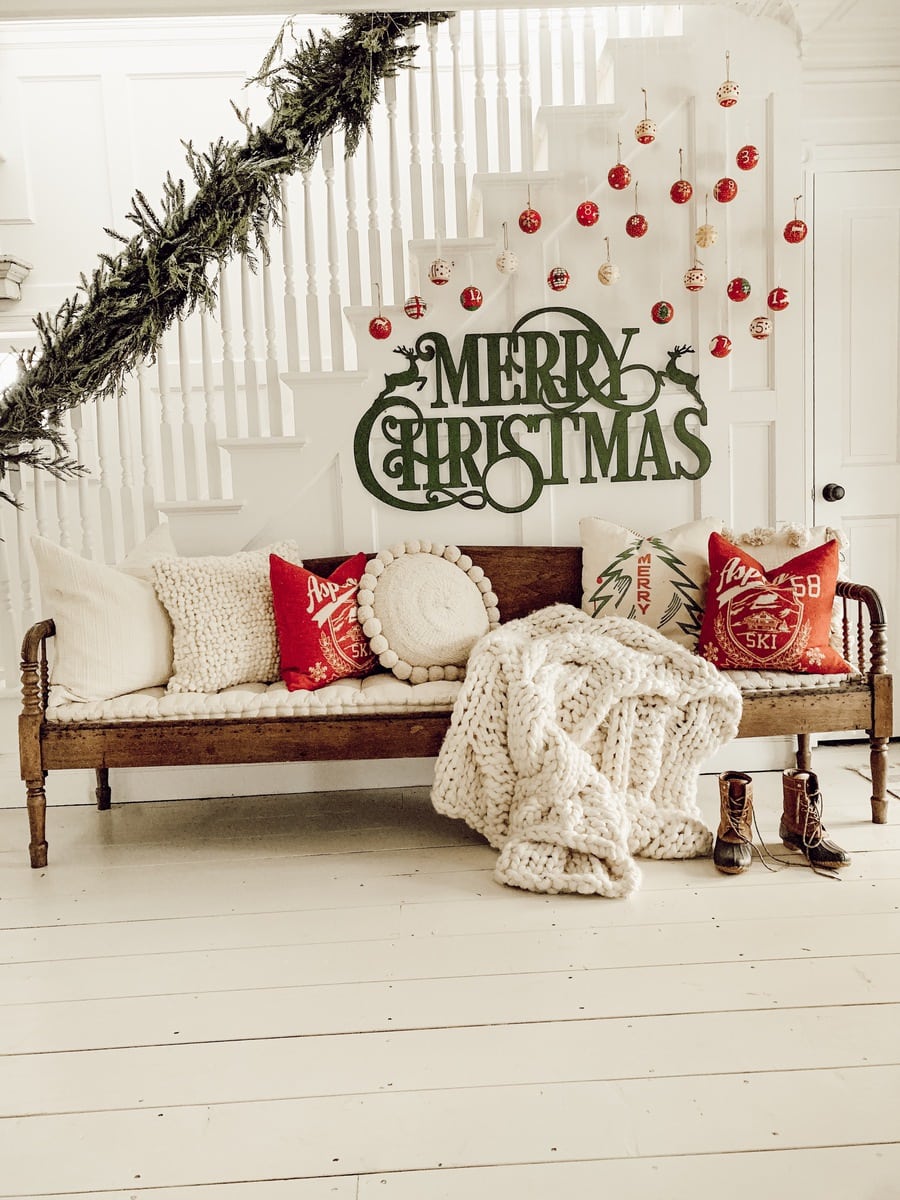 Our 10 foot antique bench is sitting in the entryway below all of these festive ornaments, but you know I had to make that bench festive as well. I added some red pillows that I found at HomeGoods a few years ago & a vintage Christmas pillow from my friend Fabric Scout Studio. Of course I added a ton of texture as well like that wool blanket from Modern Wool.