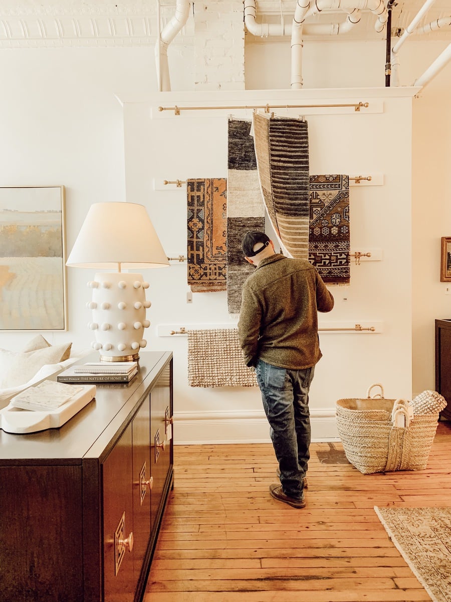 I could go on, but you get it…. she is amazing. The funny thing is, I actually didn’t know she was local until a while after following her & then seeing her list Grand Rapids on a photo she posted one time. I was in shock & had to see her work in person. The next funny thing is, right after I found this out, she announced she was opening a shop… I’m one lucky girl. I finally made my way to Stoffer Home this past weekend & took a few quick shots for you guys while I was there to give you a good vibe of the place. Why do you have to visit? From books to kitchen ware to pillows to vintage rugs & great lighting for sale it’s all so inspiring the way she puts it all together. Her shop also acts as a design studio for her clients looking for her to design their homes & so you are able to see her work in action right in the shop. I was able to pick up a few things like a lovely lumbar pillow, some soap, & a pretty scrubby brush for our dishes. Visiting her shop was so inspiring and I could have sat there for hours with my coffee because of cozy her shop was. Bonus: The workers at her shop were super helpful & nice as well….
