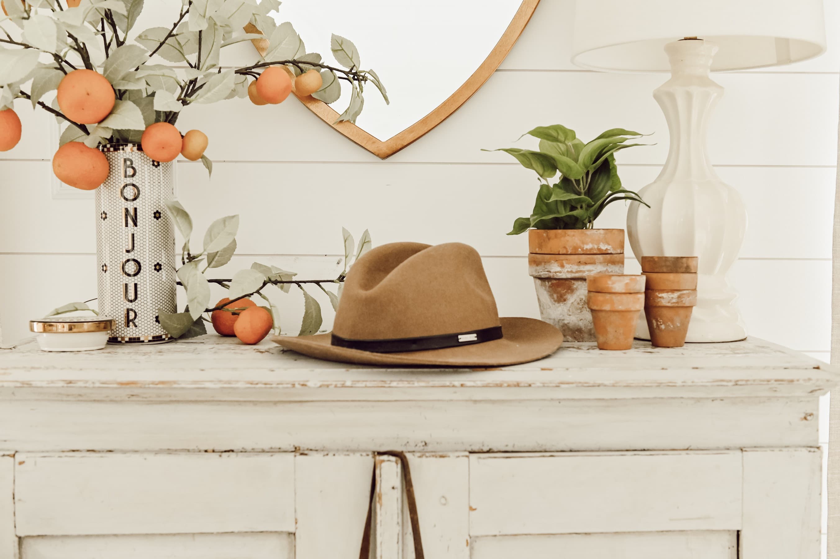 Recently I shared this blog post, How To Style a Simple Entryway, I wanted to return back to that space and show you how can add a few extra items to a space to take it from a Simple Entryway, to a uniquely collected vignette. I did two looks to show you how to update a space seasonally… check it out! For this first look I used a kitchen canister & placed those bright and sunny oranges in it as my florals for this space. I love how the oranges pop with all of those other orange leather tones in the space… & these stems just make me happy. The only regret? I wish they smelled like juicy oranges too!