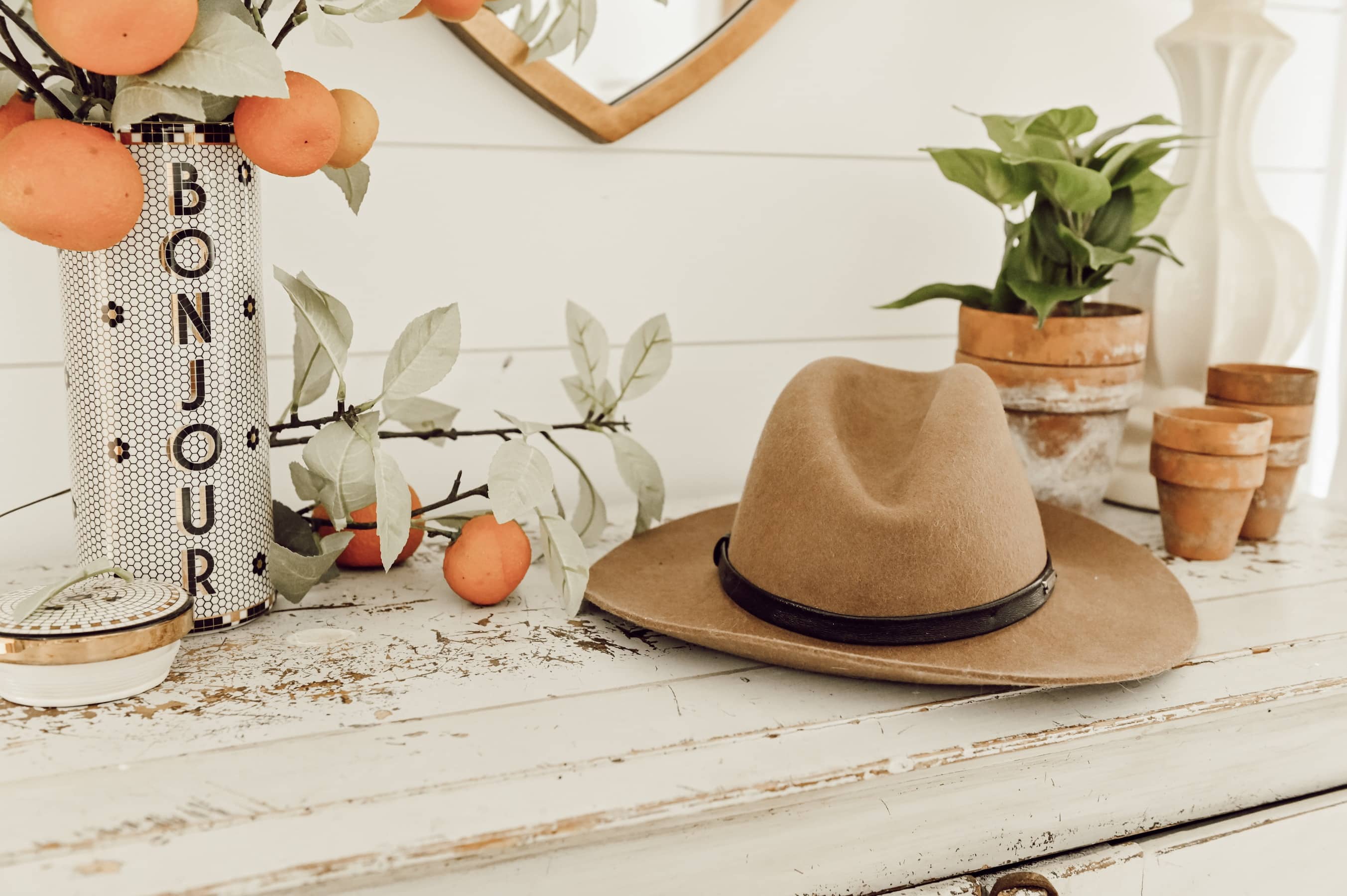Ok! First of all.. don’t get mad about my use of oranges in spring. I was craving a pop of color in one of my looks and these stems I found at our shop were calling my name! Within my love of home decor and interior design, I have a hobby… creating vignettes. I love creating little mini pockets of design within an overall design and could create vignettes over and over in the same space. I usually get my entire fix at my shop, The Found Cottage, where I can pull together brand new items and mix it with some unique antique finds to create a fun shopping experience within our store.