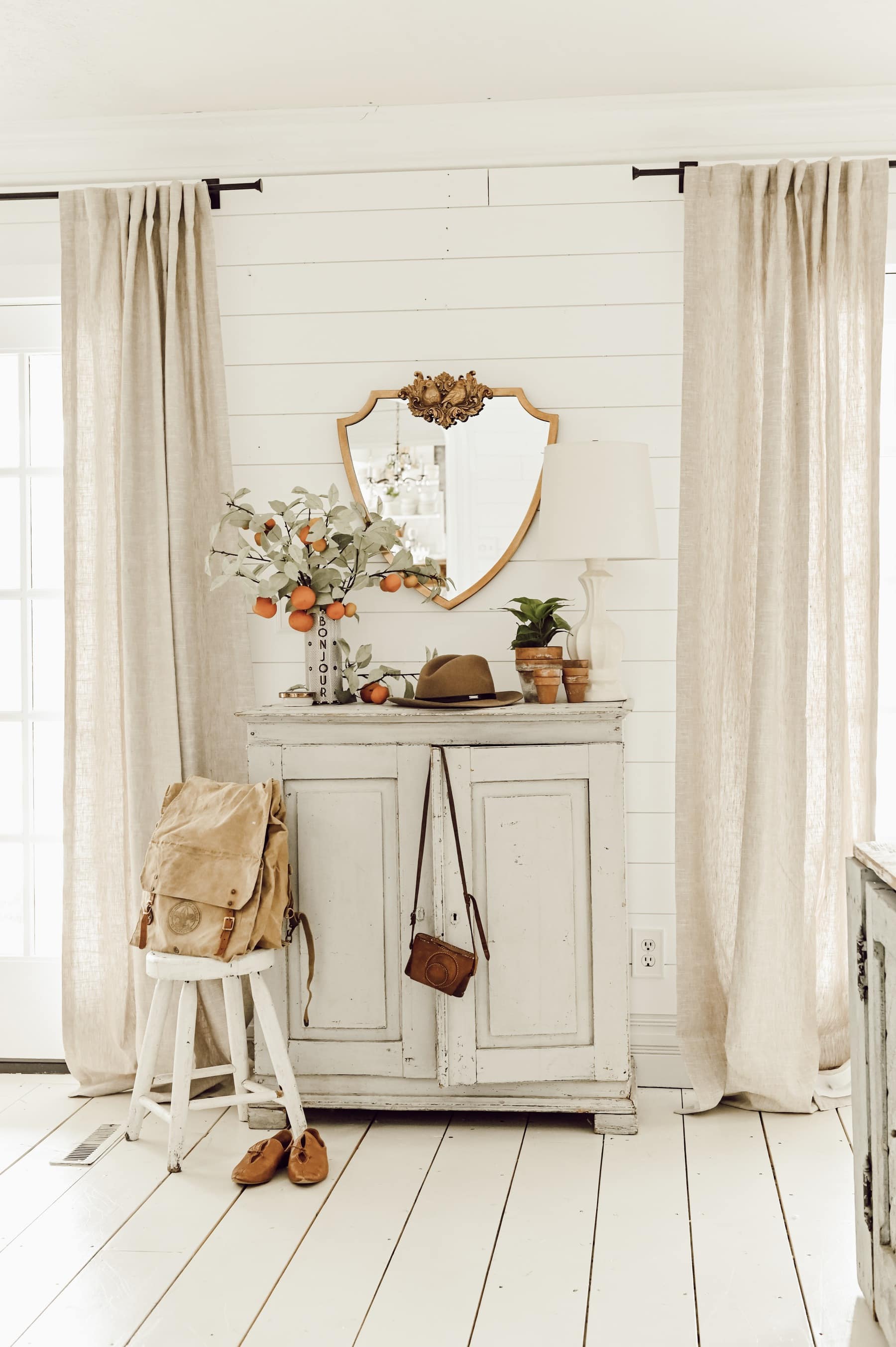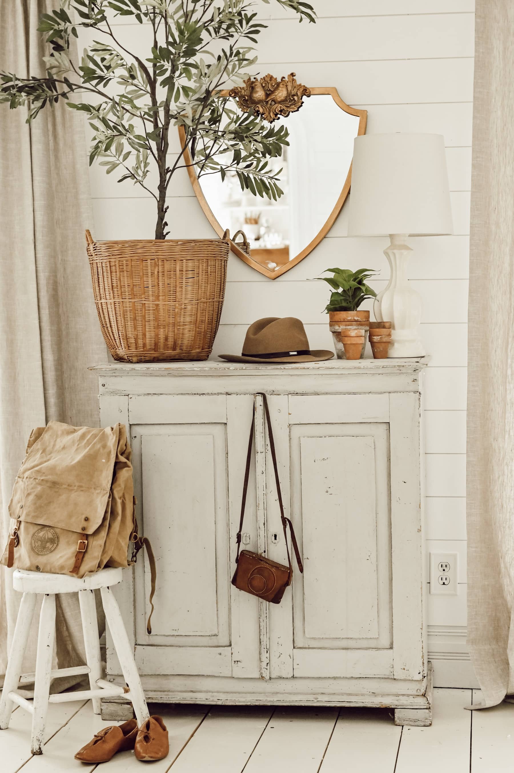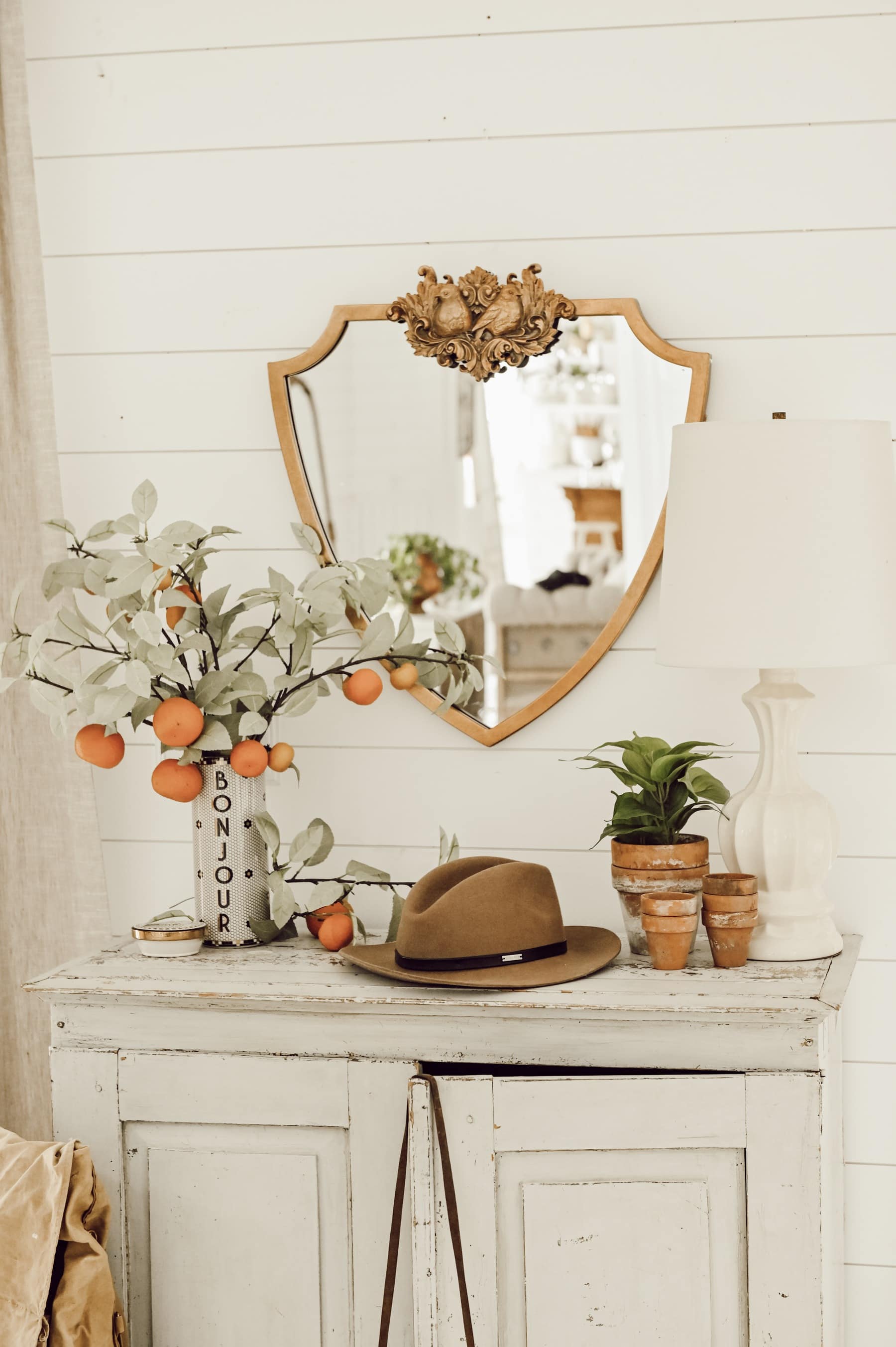The mirror is from Anthropologie. You know my obsession with gold framed mirrors. I really love the unique shield shape to this mirror, as well as the subtle display of birds at the top. Accompanied by some faux stems or a faux tree to bring the eye up and create a larger scale for the vignette. For the first look, I picked up some faux stems from my shop, The Found Cottage. I thought the hint of spring with some orange stems was a great way to splash some color around though they are usually a summer fruit.. no one is mad right? Placing them in a vase to balance the vignette while still drawing the eye up. The faux olive tree is from CB2. The tree is a great way to bring the eye up simply from its size to create that larger scale for the vignette. Olive tree’s always catch my eye as having the perfect blend of green and sophistication. Lastly, to throw a little “lived-in” vibes into the vignette I place my new favorite spring shoes from Free People. I could go on with staging spaces to look more welcoming and cozy with throws, coats, and yes-boots or shoes. Leaving them neatly staged can quickly bring life into any vignette. Such a simple light & bright spring entryway vignette that I really enjoyed playing around with today & that I hope brings tons of inspiration to you this spring season. Thank you guys so much for stopping by the blog today… it means the world to me! xx