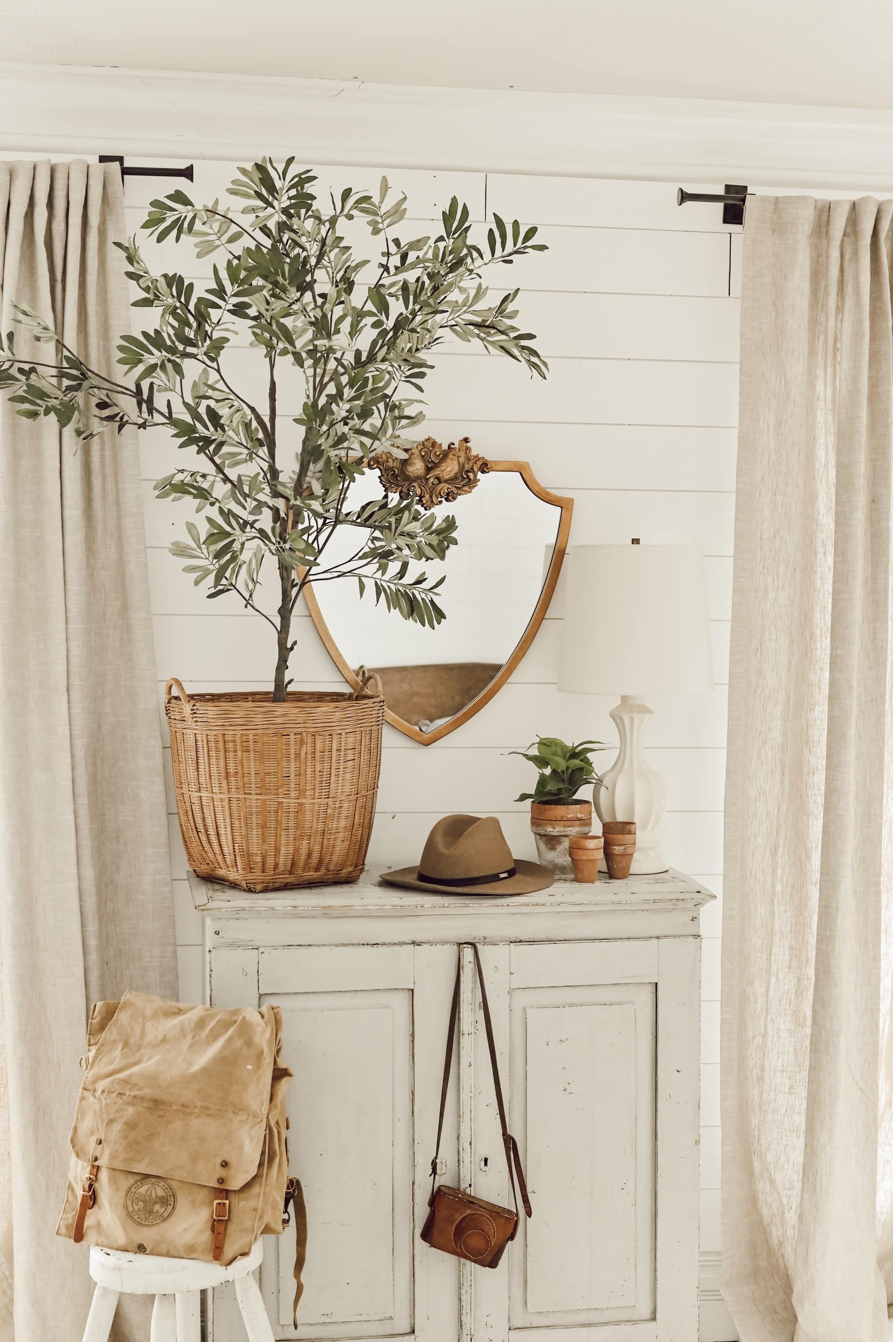 I like to think of this vignette’s core based around two new items and a few vintage items that I picked up this week. The one of a kind “finds” in this space, are one of my favorite lamps I have every come across and this very well kept wicker basket. Also that Boy Scout bag that Jose spotted while out picking this past weekend… such a great find! Pairing those to find with a new faux tree or some stems and anchoring it down with this beautiful Anthropologie mirror really is the perfect formula for me in decorating mixing the old and new.